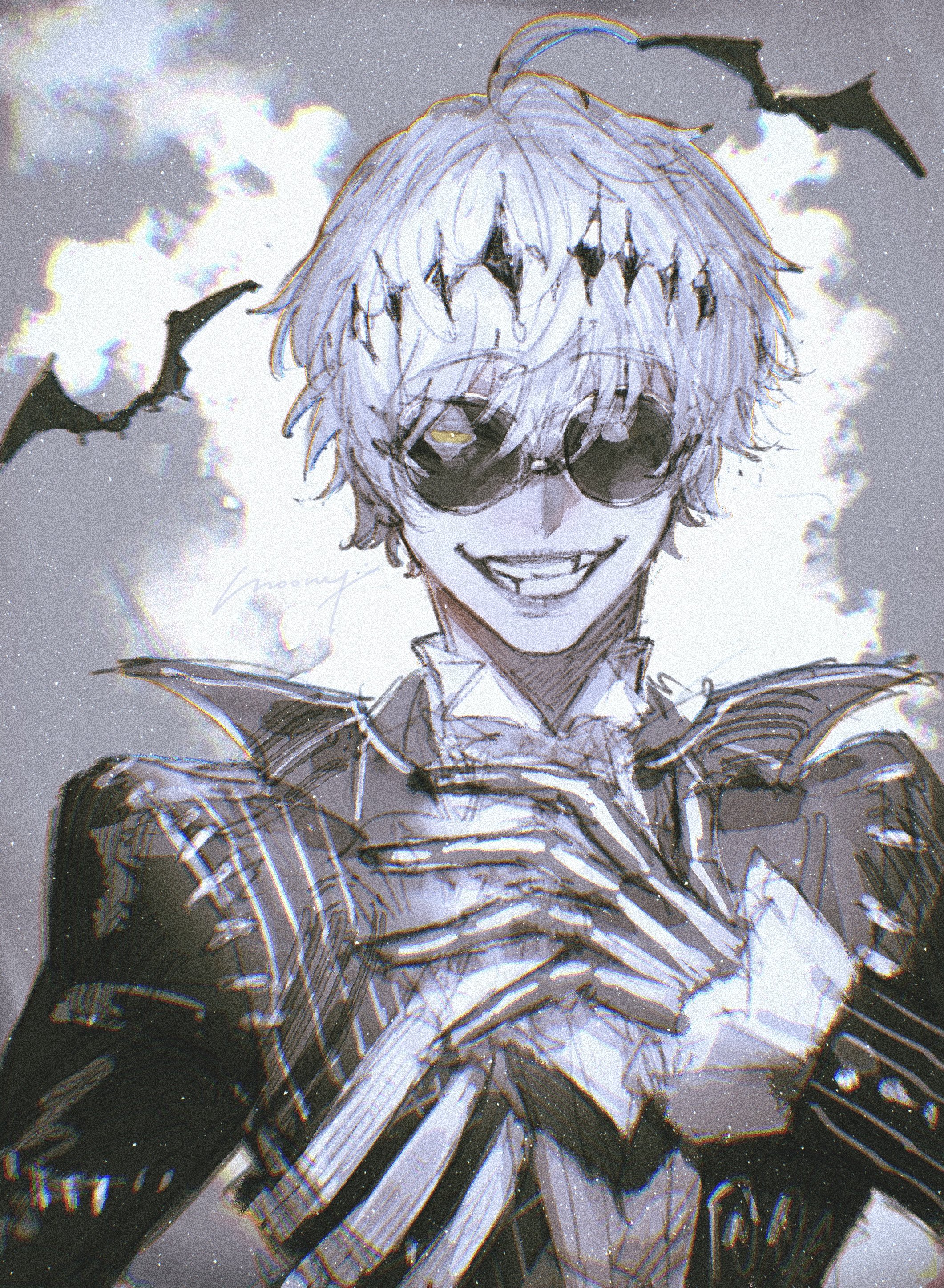 1boy absurdres ahoge bat_(animal) bat_wings bishounen black_crown colored_skin crown formal_clothes halloween hand_on_own_chest highres jack_skellington jacket long_sleeves male_focus moony_(mogmogmelt) orange_eyes pinstripe_pattern pinstripe_suit round_eyewear short_hair skeleton skeleton_print smile smirk solo stitches striped_clothes striped_jacket suit sunglasses the_nightmare_before_christmas twisted_wonderland white_hair white_skin wings