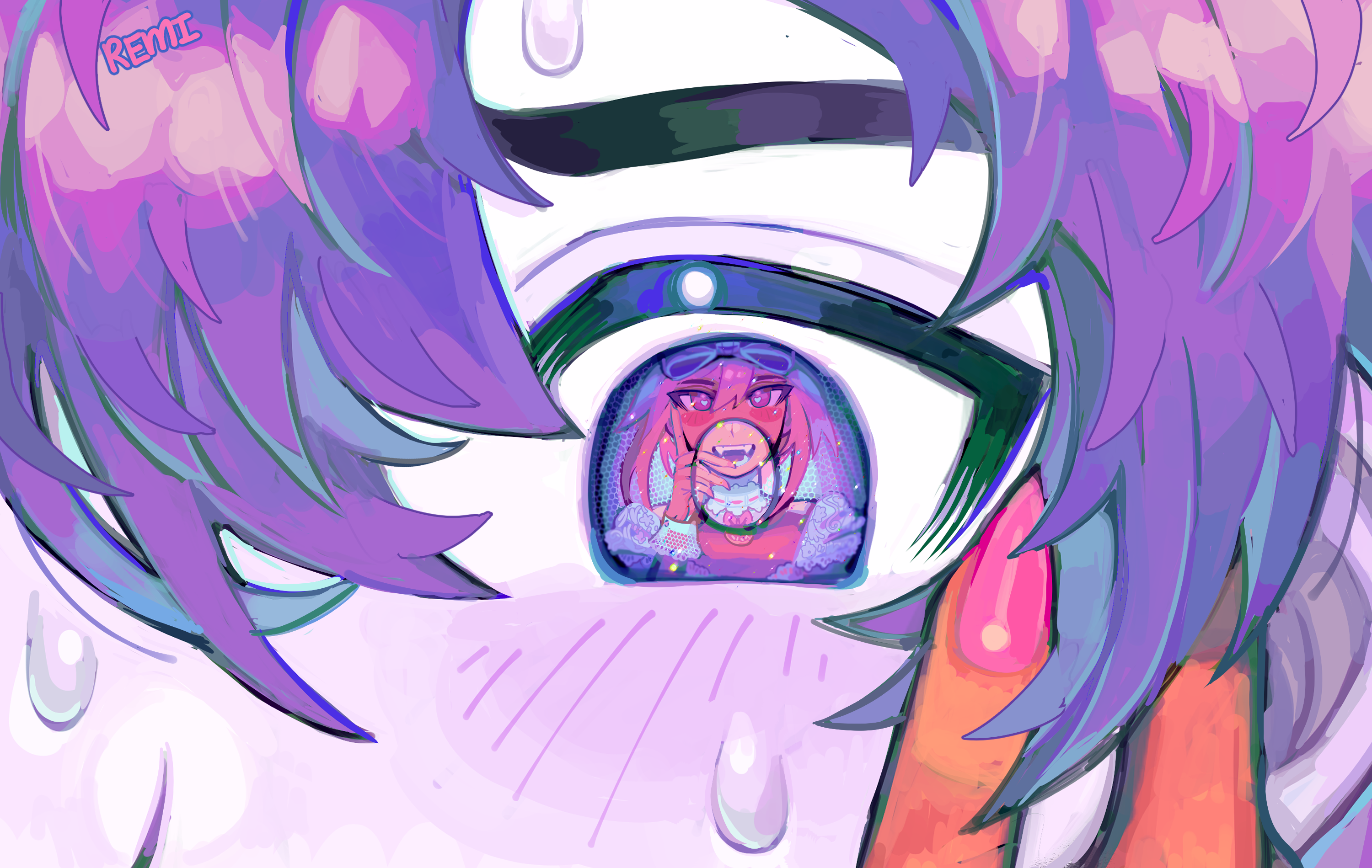 1boy 1girl artist_name blush bow bright_pupils close-up colored_skin dark-skinned_female dark_skin eye_reflection fingernails hair_between_eyes hair_bow hand_on_another's_face hand_on_own_face heart heart-shaped_pupils hero_(headspace)_(omori) hero_(omori) hetero highres interracial lace-trimmed_wrist_cuffs lace_trim nail_polish official_alternate_costume omori pink_eyes pink_hair pink_nails purple_eyes purple_hair reflection remi_(mozzaremi) sharp_fingernails sweat sweetheart_(omori) symbol-shaped_pupils white_pupils white_skin white_wrist_cuffs wrist_cuffs