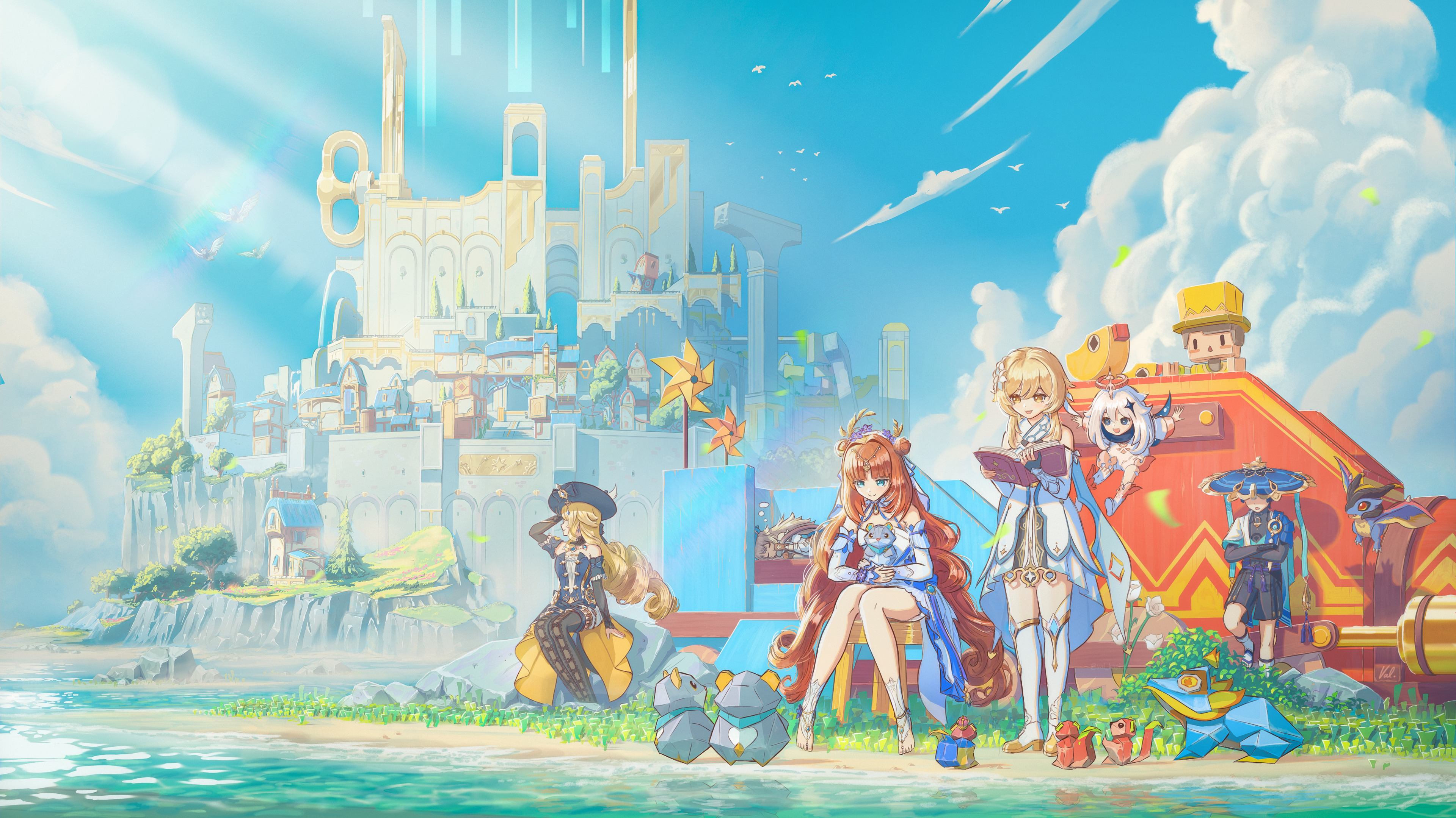 2boys 5girls absurdres animal animal_on_lap bare_shoulders barefoot bird black_hat black_thighhighs blonde_hair blue_eyes blue_hat blue_sky book boots brown_hair building cat_girl cat_tail city closed_eyes closed_mouth cloud commentary crossed_arms day detached_sleeves dragon dress drill_hair durin_(genshin_impact) english_commentary facing_viewer fingerless_gloves floating flower frog full_body genshin_impact gloves grass hair_between_eyes hair_flower hair_ornament halo hand_up hat highres holding holding_book hugging_own_tail hugging_tail japanese_clothes jingasa kirara_(genshin_impact) kirara_(phantom_in_boots)_(genshin_impact) knees_together_feet_apart long_hair looking_to_the_side lumine_(genshin_impact) lying mechanical_halo mini_durin_(genshin_impact) multiple_boys multiple_girls navia_(genshin_impact) nilou_(breeze_of_sabaa)_(genshin_impact) nilou_(genshin_impact) official_alternate_costume on_lap on_side open_book open_mouth outdoors paimon_(genshin_impact) reading red_eyes red_hair romper scaramouche_(genshin_impact) short_hair short_hair_with_long_locks sitting sky sleeping sleeveless sleeveless_dress small_dragon smile squirrel standing strapless strapless_dress sunlight tail thigh_boots thighhighs toes tree val_kapi very_long_hair wanderer_(genshin_impact) water white_dress white_flower white_footwear white_hair white_romper yellow_eyes zettai_ryouiki