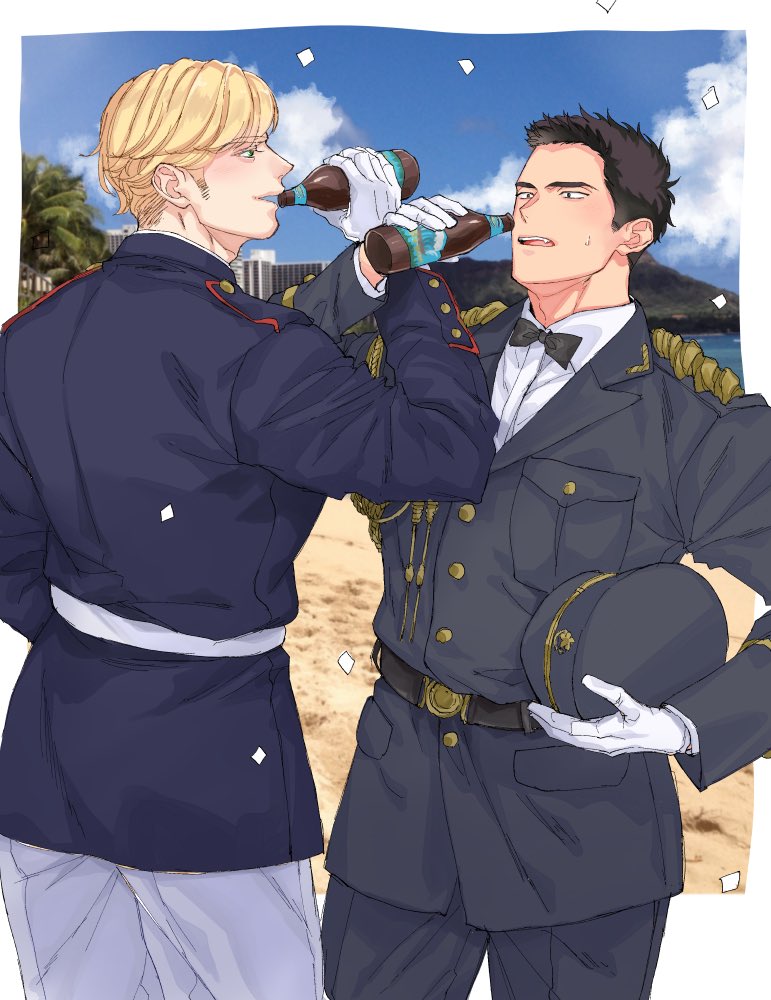 2boys ao_isami beach beer_bottle black_bow black_bowtie black_hair blonde_hair bottle bow bowtie commentary_request confetti facial_hair gloves green_eyes hat holding holding_bottle holding_unworn_clothes holding_unworn_hat lewis_smith male_focus military_uniform mmmmichisato multiple_boys outdoors sand short_hair sideburns_stubble sky stubble unworn_hat unworn_headwear white_gloves yuuki_bakuhatsu_bang_bravern