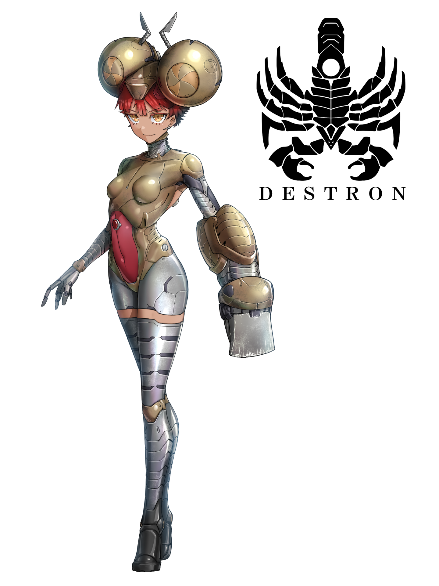 1girl ant_girl antennae arthropod_girl breasts commentary covered_navel cyborg eidenjyou1997 english_commentary genderswap genderswap_(mtf) highres impossible_clothes joints kamen_rider kamen_rider_v3_(series) lens_ari logo looking_at_viewer monster_girl pincers red_hair robot_joints short_hair simple_background small_breasts solo white_background yellow_eyes