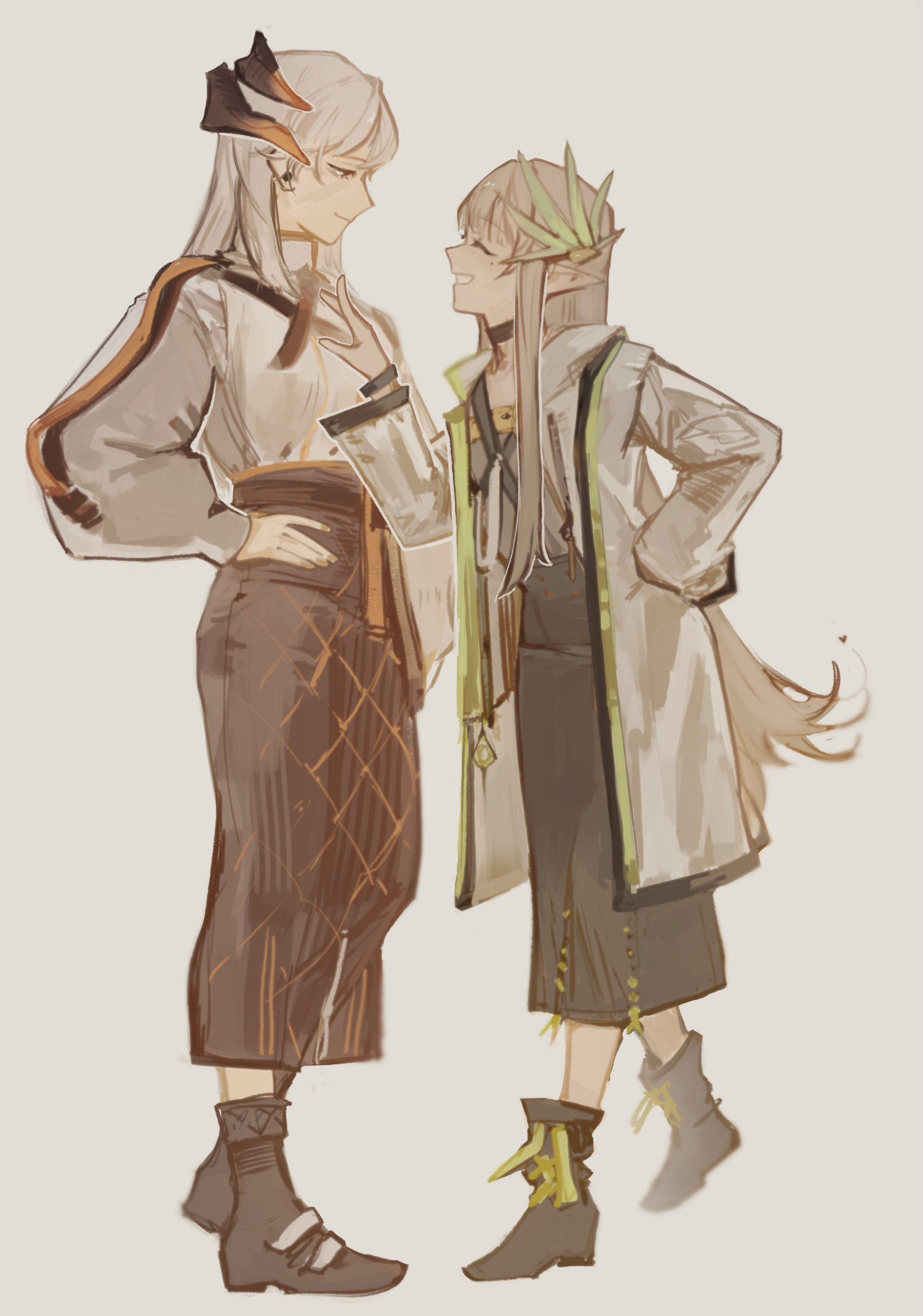 2girls absurdres arknights black_footwear black_skirt boots brown_hair closed_eyes closed_mouth coat commentary english_commentary grey_background grin hand_on_own_hip highres horns long_hair long_skirt long_sleeves mole mole_under_eye muelsyse_(arknights) multiple_girls nia_(xinyanfanclub) open_mouth pointy_ears saria_(arknights) shirt simple_background skirt smile white_coat white_hair white_shirt