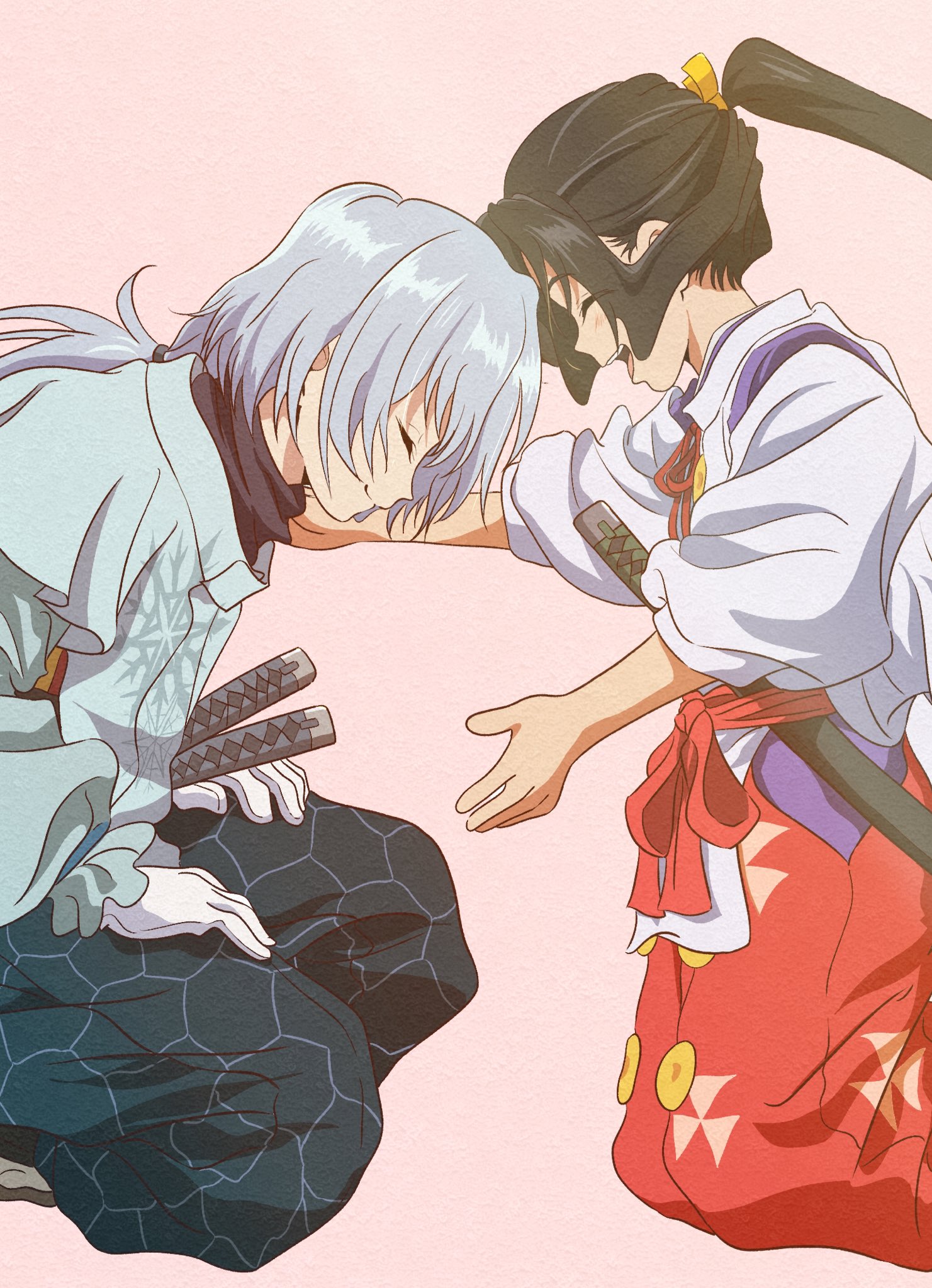 2boys :d black_hair blue_hakama blush bow bowing closed_mouth feet_out_of_frame frilled_sleeves frills from_side fubuki_(nige_jouzu_no_wakagimi) gloves grey_hair hair_over_one_eye hakama hand_on_another's_shoulder hands_on_lap highres houjou_tokiyuki_(nige_jouzu_no_wakagimi) japanese_clothes kariginu katana kneeling long_hair low_ponytail male_focus motoyui multiple_boys nige_jouzu_no_wakagimi open_mouth outstretched_arm outstretched_hand parted_bangs pink_background ponytail red_hakama red_sash sash scene_reference seiza sheath sheathed sidelocks_tied_back simple_background sitting sleeves_rolled_up smile snowflake_print sword teeth turtleneck upper_teeth_only weapon white_gloves wolf_cut yuki_mizuki3