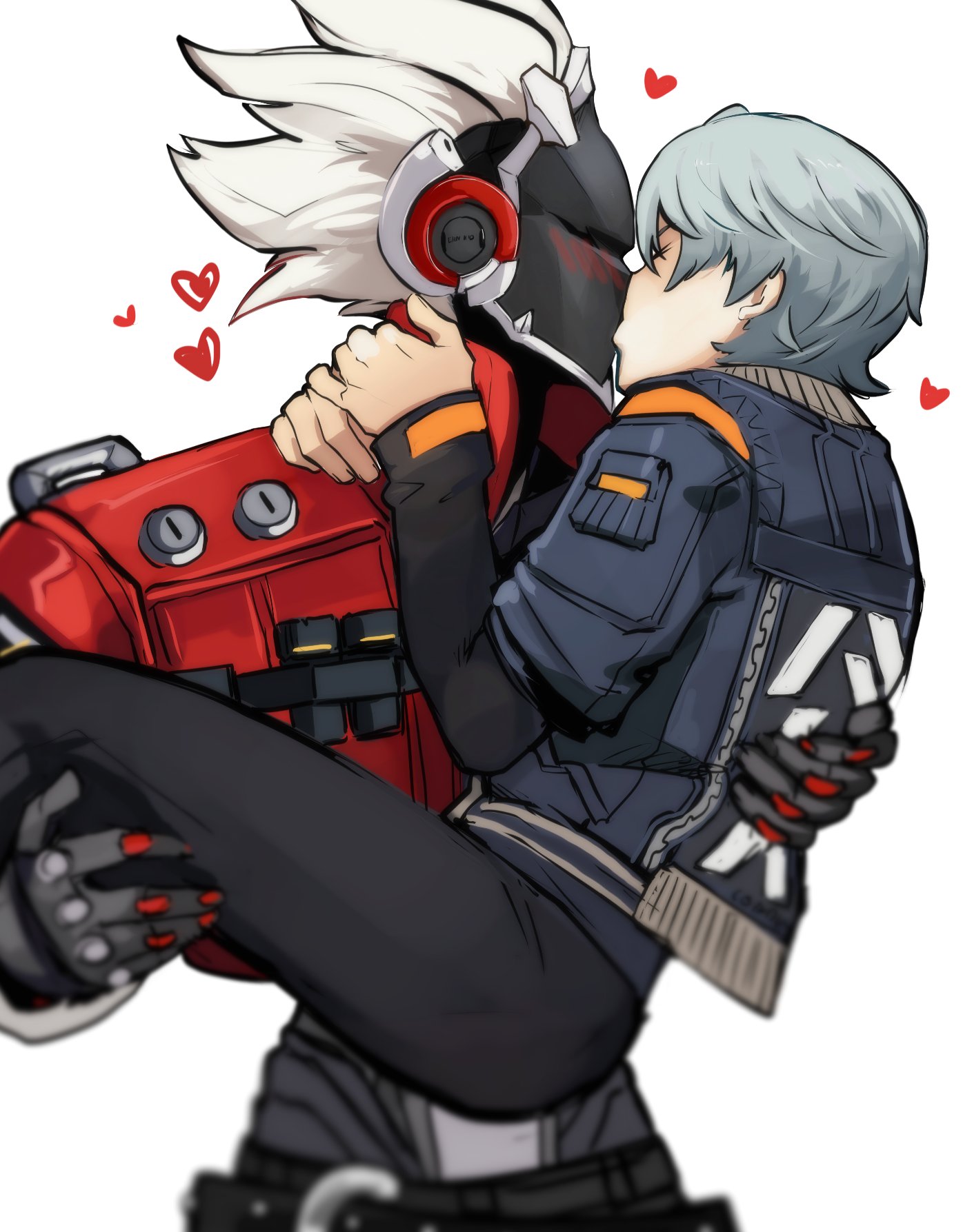 2boys billy_kid black_gloves black_pants blue_jacket blush carrying carrying_person closed_eyes commentary english_commentary feet_out_of_frame gloves hands_on_another's_neck headset heart helmet highres idoraad jacket long_sleeves male_focus multiple_boys pants red_jacket short_hair simple_background white_background white_hair wise_(zenless_zone_zero) yaoi zenless_zone_zero