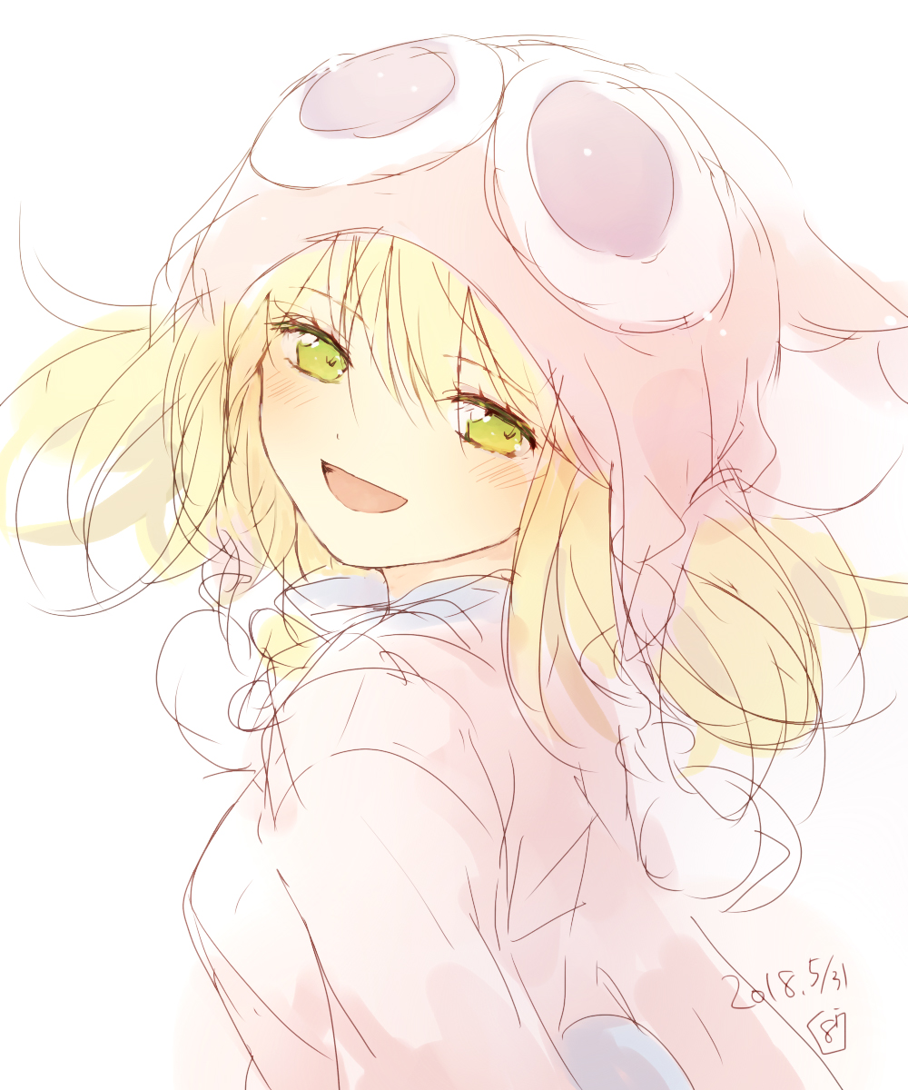 1girl amitie_(puyopuyo) blonde_hair blush character_hat dated eyelashes from_side green_eyes hana_(mew) hat highres long_sleeves looking_at_viewer messy_hair open_mouth puyo_(puyopuyo) puyopuyo puyopuyo_fever red_hat simple_background sketch solo upper_body white_background