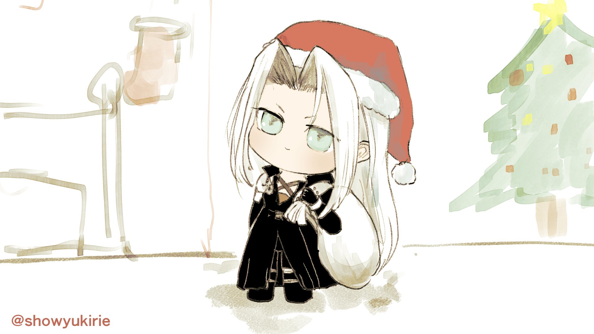 1boy armor black_coat blush chest_strap chibi chibi_only christmas_ornaments christmas_stocking christmas_tree coat final_fantasy final_fantasy_vii fireplace fur-trimmed_headwear fur_trim gloves grey_hair hat highres kiri_megumi long_bangs long_coat long_hair male_focus pauldrons sack santa_hat sephiroth shoulder_armor sketch_background twitter_username