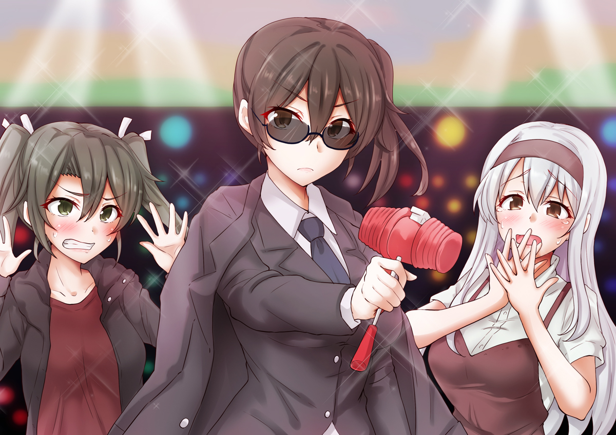 3girls alternate_costume anti_(untea9) black_hair black_jacket black_necktie brown_dress brown_eyes brown_hair brown_hairband clenched_teeth collared_shirt commentary_request covering_own_mouth dress dress_shirt formal_clothes green_eyes grey_hair hairband jacket jacket_on_shoulders kaga_(kancolle) kantai_collection long_hair multiple_girls necktie official_alternate_costume parody red_shirt shirt shoukaku_(kancolle) shoukaku_(zuiun_festival)_(kancolle) side_ponytail suit suit_jacket sunglasses teeth toy_hammer twintails umamusume umapyoi_densetsu upper_body w_arms white_hair white_shirt zuikaku_(jal)_(kancolle) zuikaku_(kancolle)