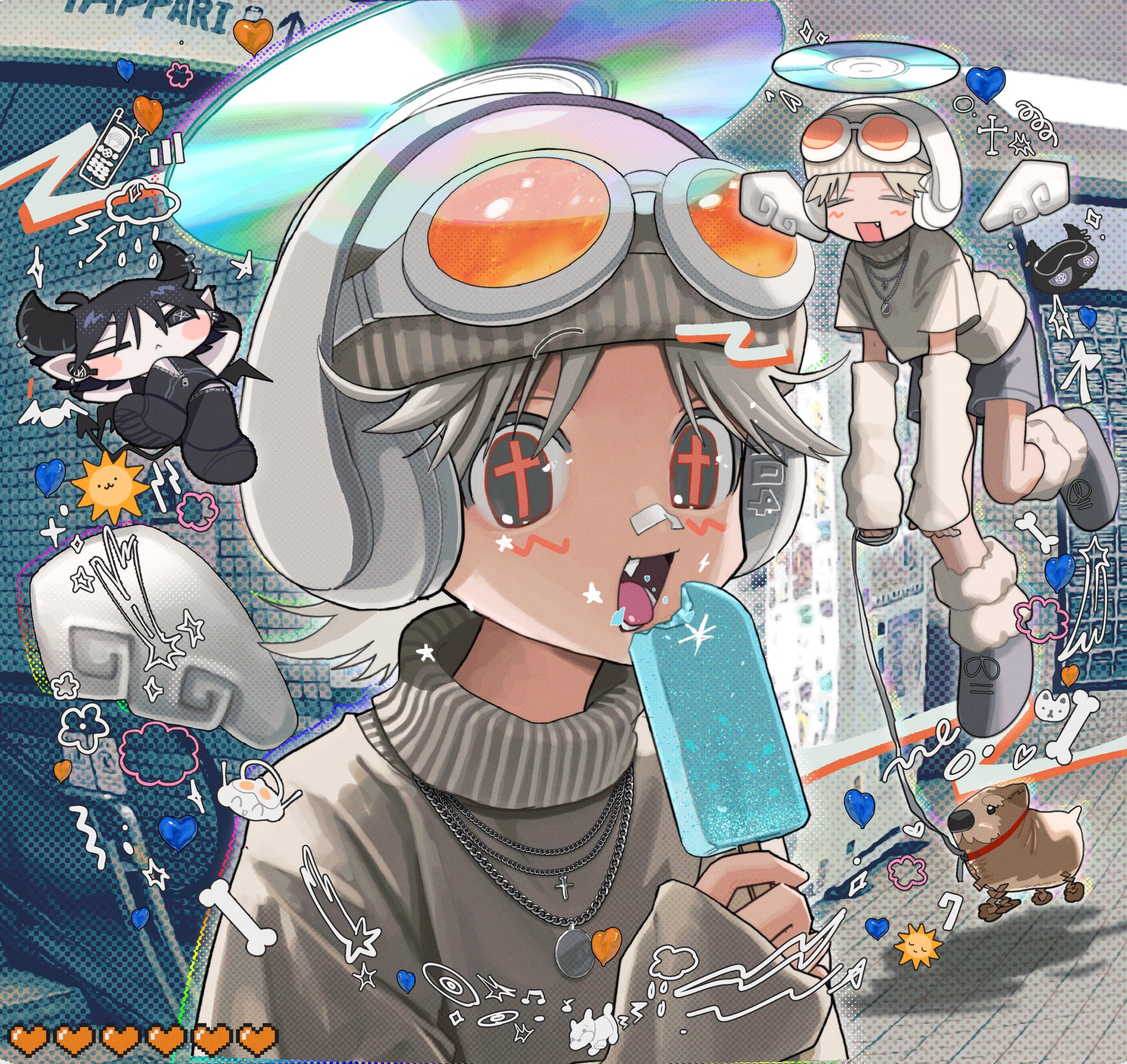 104_(yappari) 2000s_(style) 2boys 666_(yappari) angel angel_wings beanie black_hair borrowed_character cd chibi chibi_inset commentary cross-shaped_pupils demon_boy demon_horns demon_wings detached_wings eating food goggles goggles_on_headwear grey_eyes grey_hair halo hat highres holding holding_food holding_popsicle horns looking_at_viewer male_focus multiple_boys open_mouth original outdoors poin_(goruchopame) popsicle portrait streetwear sweater symbol-shaped_pupils upper_body wings