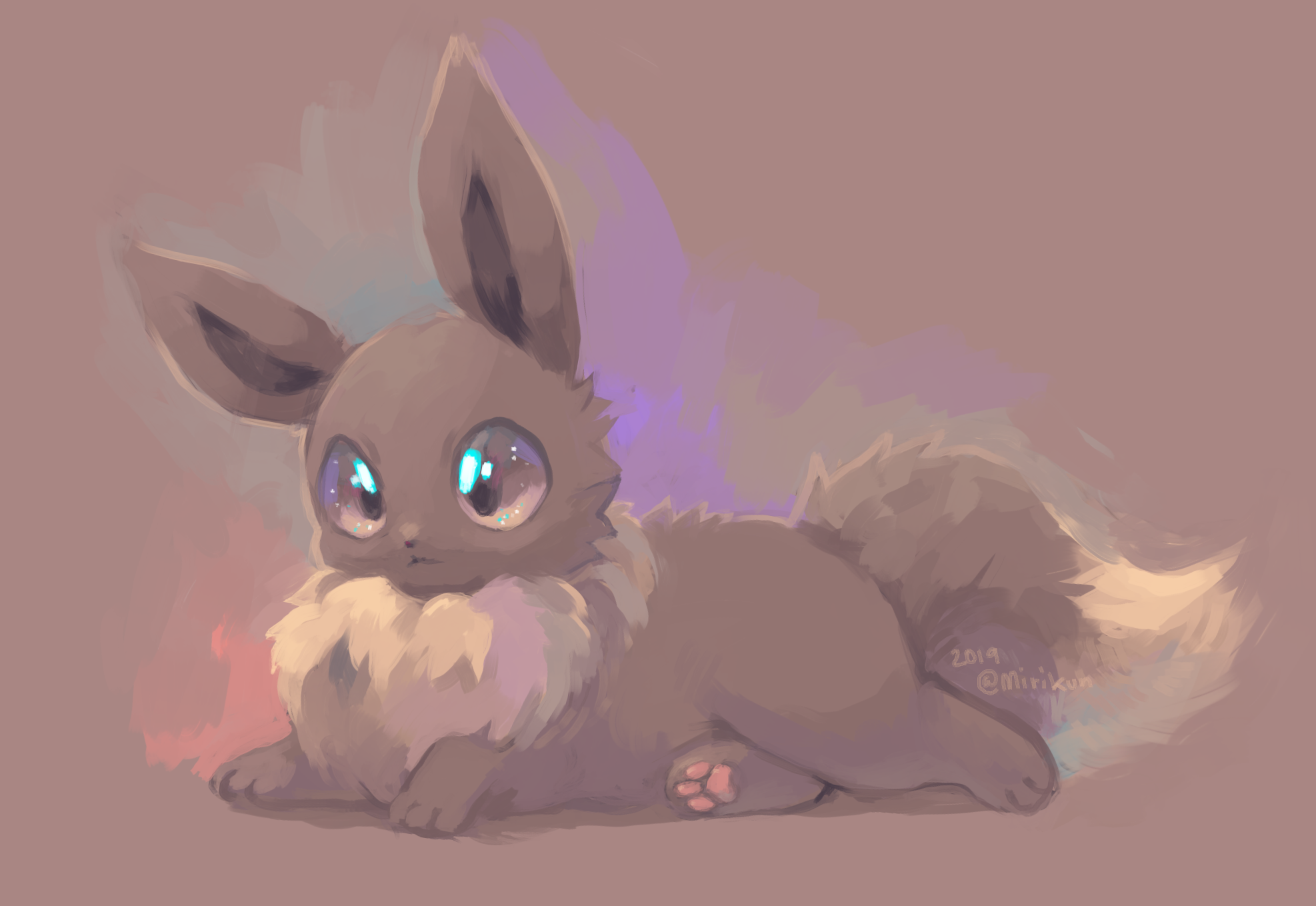 animal_focus artist_name brown_background brown_eyes closed_mouth commentary_request dated eevee from_side full_body gen_1_pokemon hatomura_miri highres looking_ahead lying nintendo no_humans on_stomach pokemon pokemon_(creature) simple_background solo