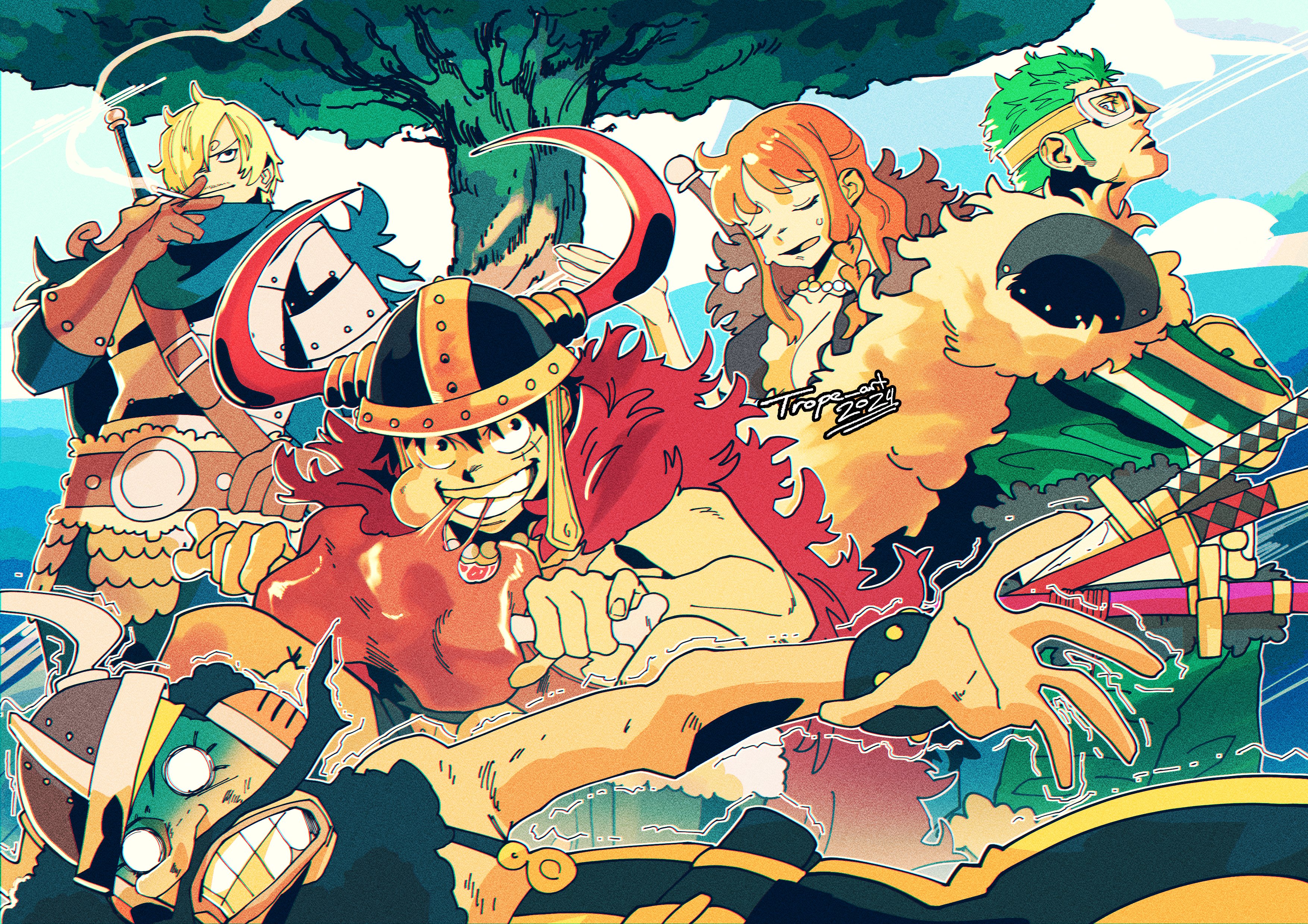 1girl 2024 4boys absurdres armor black_hair blank_eyes blonde_hair braid braided_sidelock cape cigarette closed_eyes commentary commentary_request curly_eyebrows eating english_commentary fake_beard fake_facial_hair fake_horns food fur_cape green_hair hair_over_one_eye headphones helmet highres horns looking_ahead looking_at_viewer meat monkey_d._luffy multiple_boys nami_(one_piece) nami_(one_piece)_(elbaf) one_piece orange_hair profile puff_of_air roronoa_zoro sanji_(one_piece) scar scar_on_face shoulder_pads sideburns signature sky smoke sword sword_on_back tree trembling trope_art usopp weapon weapon_on_back