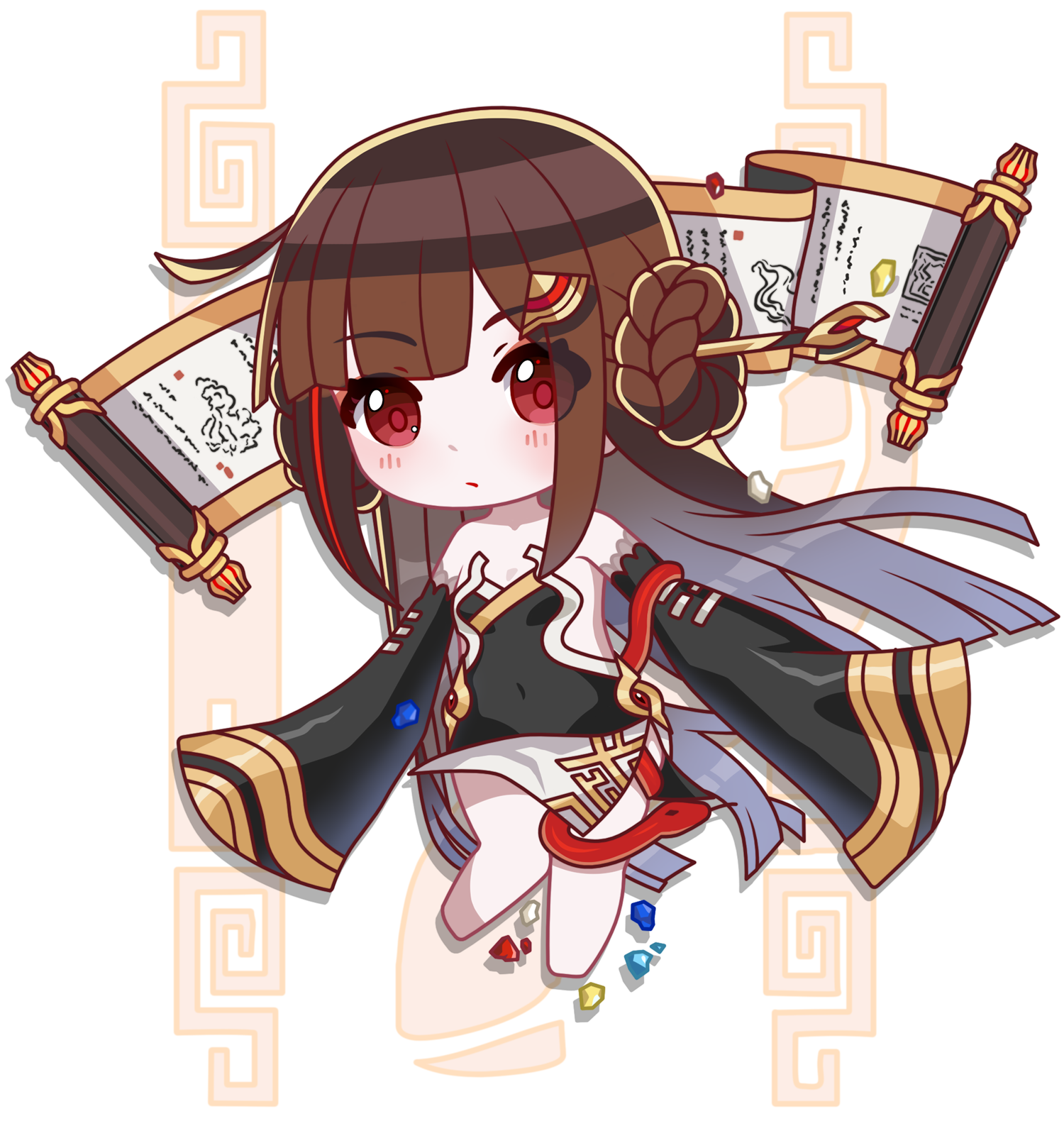1girl bare_shoulders black_dress black_sleeves braid braided_bun brown_hair chibi chibi_only chinese_clothes chinese_commentary commentary detached_sleeves dress full_body hair_bun hair_ornament highres honkai_(series) honkai_impact_3rd long_hair looking_at_viewer multicolored_hair nuwa_(honkai_impact) pomo910 red_eyes red_hair scroll sidelocks sleeves_past_fingers sleeves_past_wrists solo streaked_hair very_long_hair