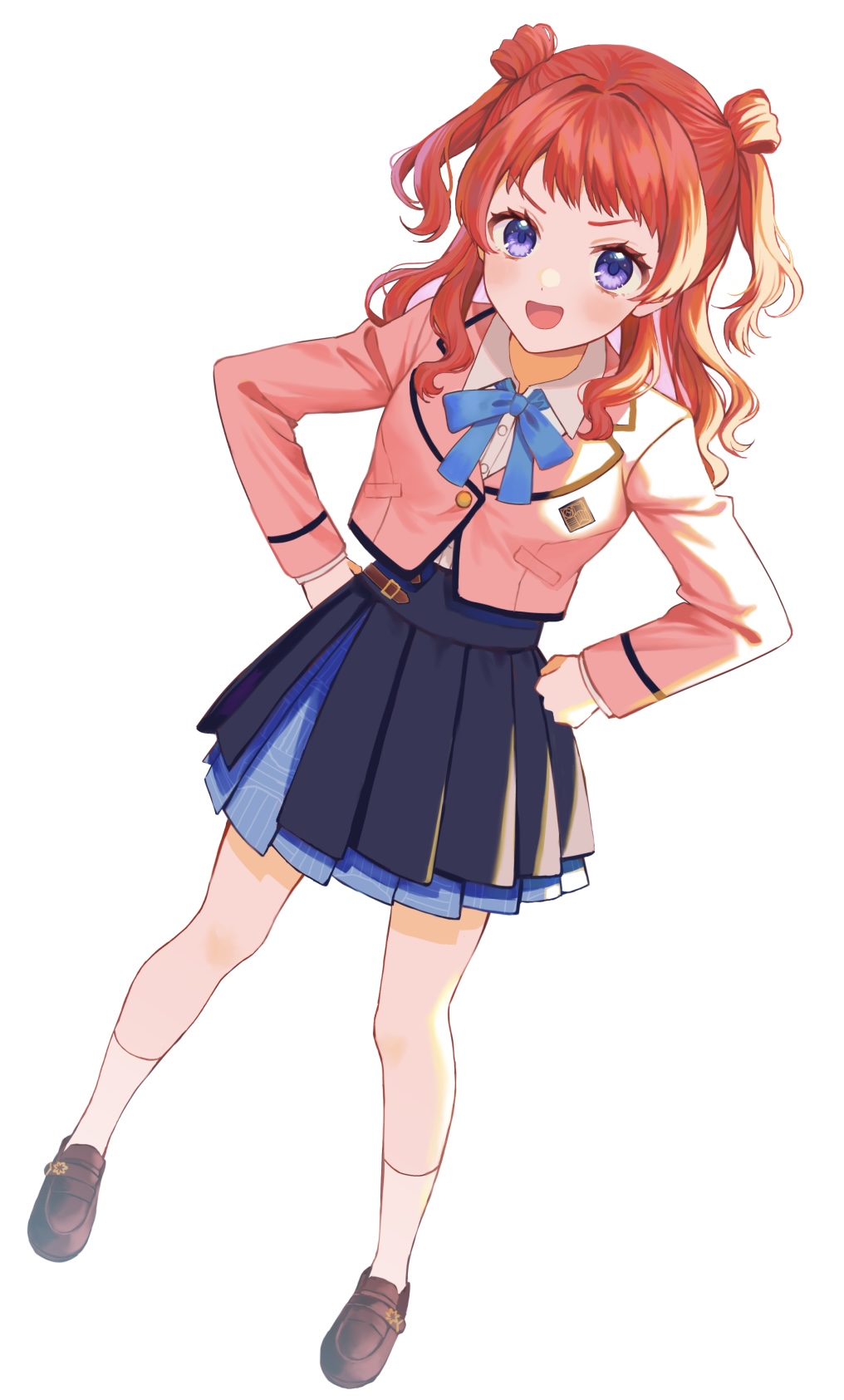 1girl black_overskirt blazer blue_ribbon blue_skirt blush brown_shoes commentary dutch_angle full_body gakuen_idolmaster hanami_saki hatsuboshi_gakuen_school_uniform highres idolmaster jacket loafers long_hair long_sleeves looking_ahead neck_ribbon pink_jacket pleated_skirt pzmnb ribbon school_uniform shirt shoes simple_background skirt smile socks solo two_side_up white_background white_shirt white_socks