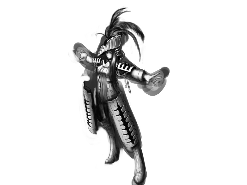 1girl abaddon_(eve_online) amarr_empire_(eve_online) armor artist_request battleship_(eve_online) breasts combat_ship_(eve_online) commentary eve_online full_body greyscale hat_feather long_hair long_sleeves medium_breasts monochrome outstretched_arms personification shoulder_armor simple_background solo standing third-party_source white_background