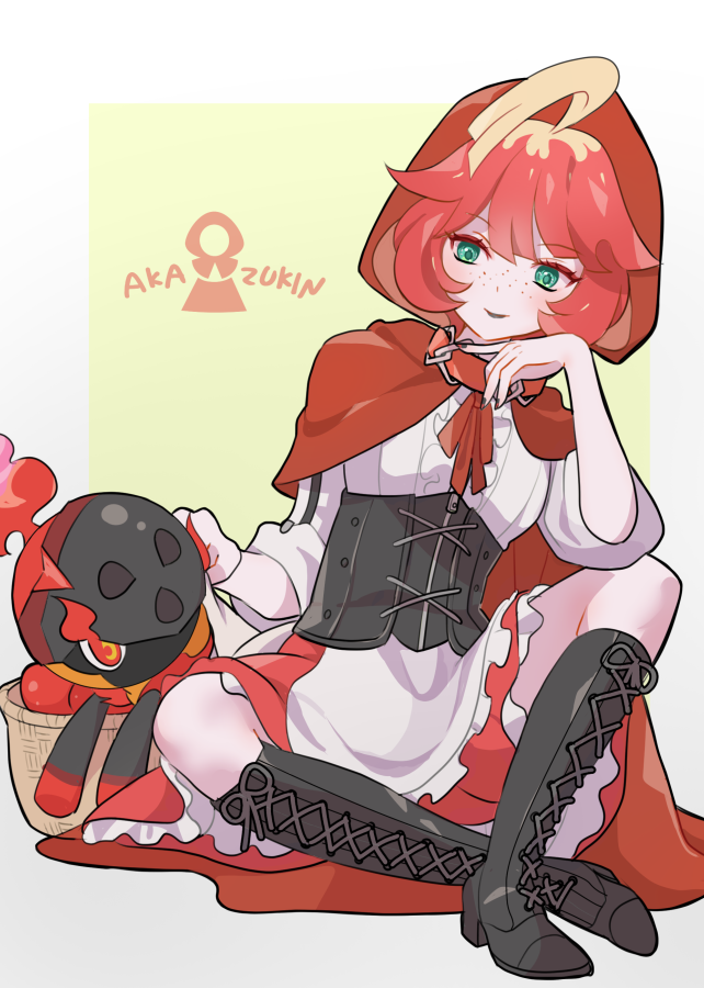 1girl ahoge basket blonde_hair boots capelet charcadet cloak closed_mouth cosplay dress fire freckles green_eyes hood hooded_capelet little_red_riding_hood_(fairy_tale) little_red_riding_hood_(fairy_tale_character)_(cosplay) little_red_riding_hood_(fairy_tale_character) mela_(pokemon) mizuiro123 multicolored_hair nintendo pokemon pokemon_(creature) pokemon_scarlet_and_violet red_capelet red_cloak red_hair red_hood shirt short_hair smile two-tone_hair