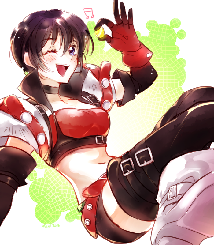 1girl :d belt black_choker black_hair breasts choker crop_top gloves holding liel_(andaniel) looking_at_viewer midriff money musical_note navel one_eye_closed open_mouth purple_eyes rutee_katrea short_hair shorts smile solo tales_of_(series) tales_of_destiny very_short_hair