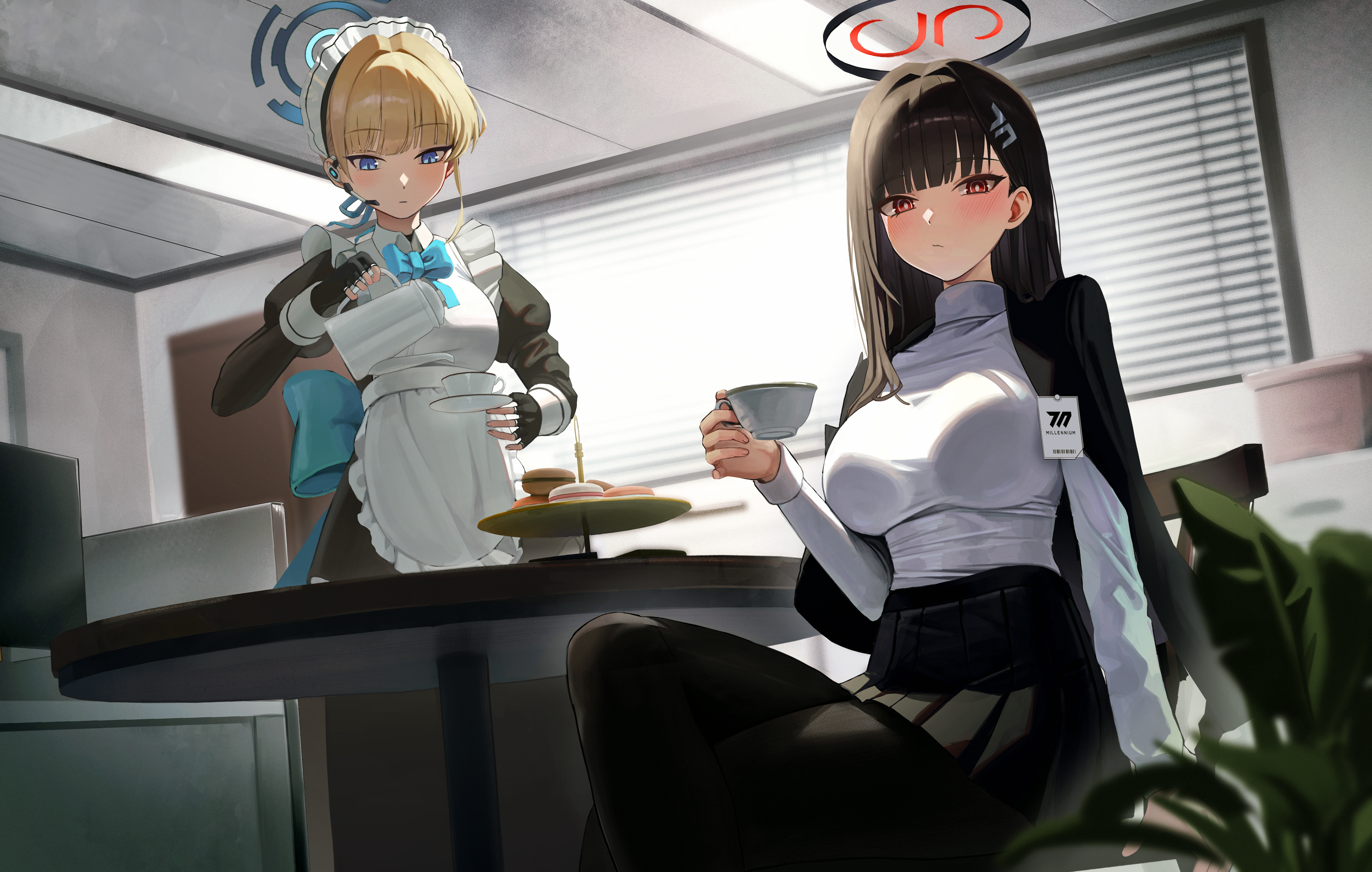 2girls absurdres apron black_dress black_gloves black_hair black_jacket black_pantyhose black_skirt blazer blonde_hair blue_archive blue_eyes blurry blush breasts crossed_legs cup depth_of_field dress feet_out_of_frame fingerless_gloves food frilled_apron frills gloves hallo_(rltkdydrltk) halo headset highres holding holding_cup holding_saucer holding_teapot id_card indoors jacket jacket_on_shoulders juliet_sleeves large_breasts long_sleeves looking_at_viewer looking_down macaron maid maid_apron maid_headdress multiple_girls pantyhose pleated_skirt pouring puffy_sleeves red_eyes rio_(blue_archive) saucer sitting skirt sweater teacup teapot toki_(blue_archive) white_apron white_sweater window_blinds
