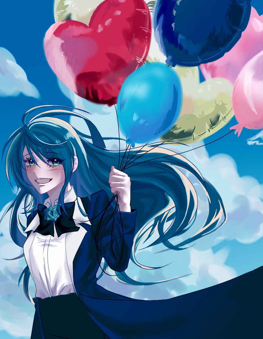 1girl ado_(utaite) black_bow black_bowtie blue_coat blue_eyes blue_flower blue_hair blue_rose bow bowtie brooch chando_(ado) cloud coat collared_shirt commentary cumulonimbus_cloud dress_shirt flower flower_brooch hair_between_eyes long_hair long_sleeves mole mole_under_eye open_clothes open_coat open_mouth pero1024a rose shirt solo utaite white_shirt