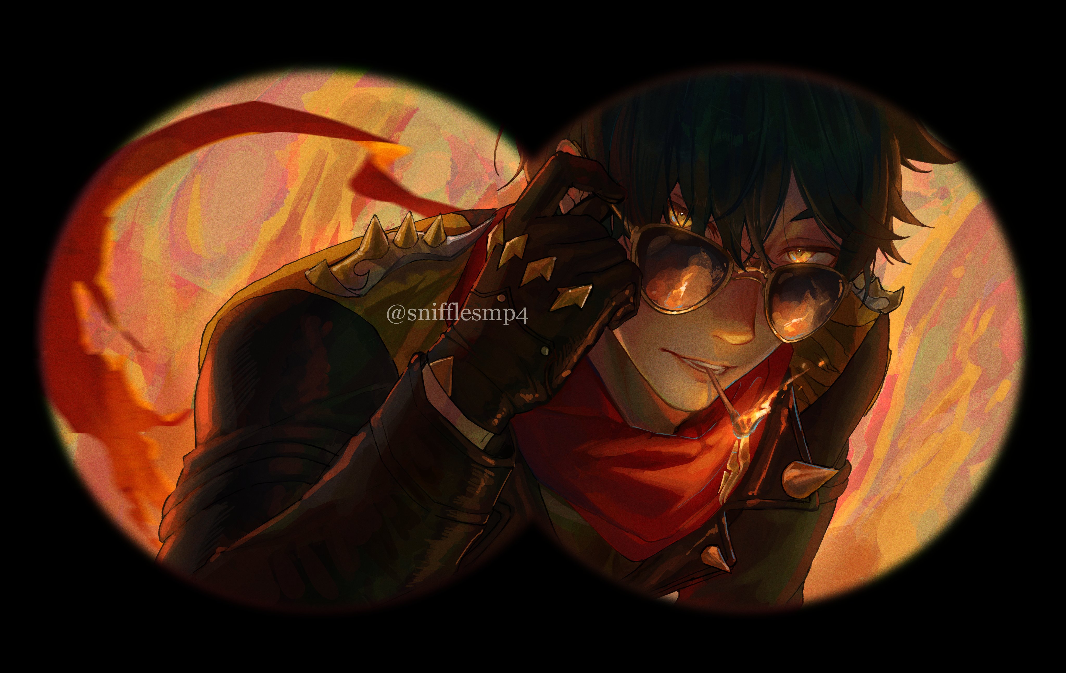 1boy absurdres adjusting_eyewear black_gloves black_jacket commentary english_commentary fire gloves hair_between_eyes highres jacket lapels layered_sleeves lighter_(zenless_zone_zero) long_sleeves looking_at_viewer male_focus parted_lips pov_binoculars red_scarf scarf shoulder_spikes snifflesmp4 solo spiked_jacket spikes studded_gloves sunglasses teeth twitter_username yellow_eyes zenless_zone_zero