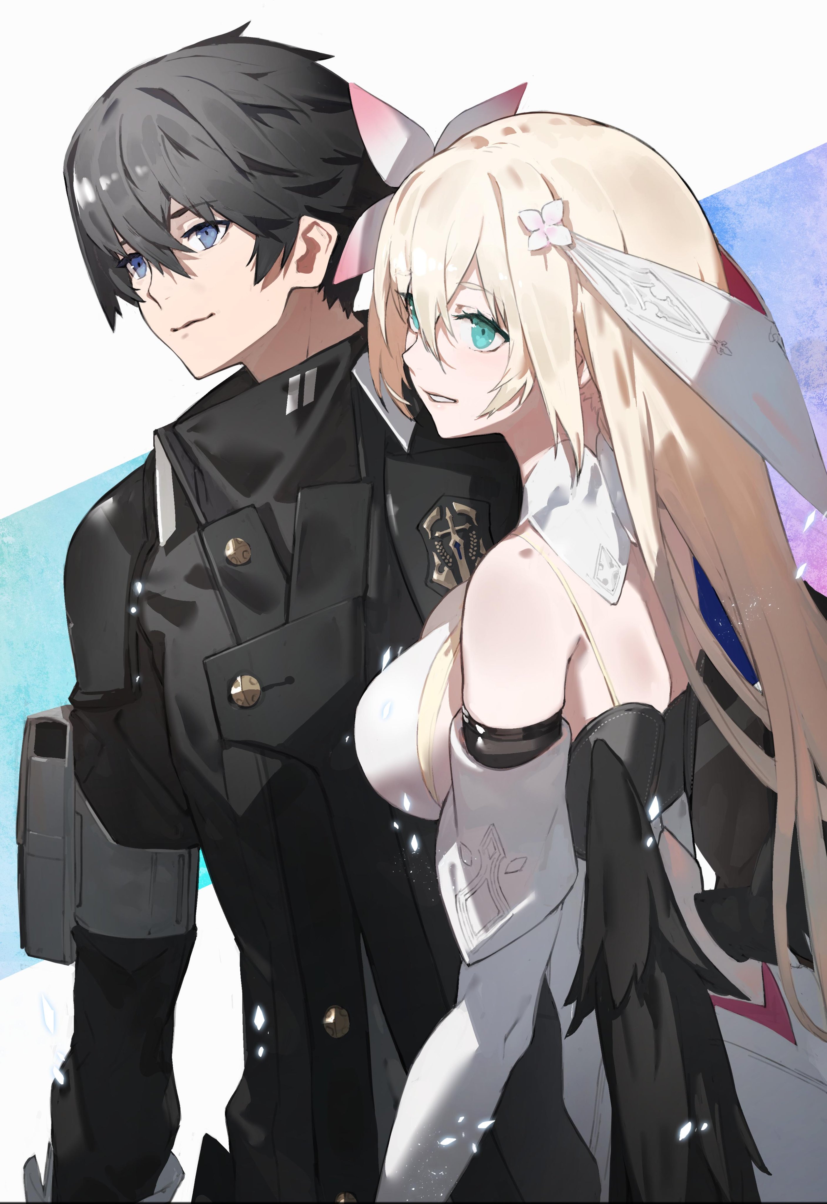 1boy 1girl absurdres angel_wings armor black_hair black_wings blonde_hair blue_eyes breasts flower green_eyes hair_flower hair_ornament highres kai_sakura_vento long_hair medium_breasts naze_boku_no_sekai_wo_daremo_oboeteinai_no_ka? neco novel_illustration official_art rinne_(naze_boku_no_sekai_wo_daremo_oboeteinai_no_ka?) smile wings