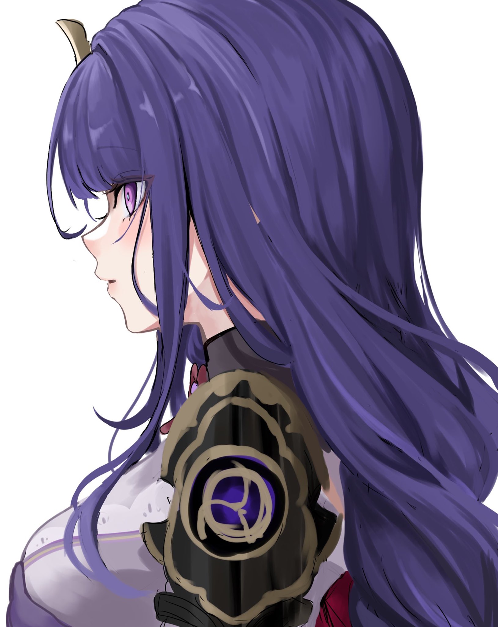 1girl armor blunt_bangs braid breasts genshin_impact hair_ornament highres japanese_clothes kimono long_hair looking_to_the_side medium_breasts mitsudomoe_(shape) neck_ribbon open_mouth pink_eyes purple_hair purple_kimono raiden_shogun red_ribbon rei_(sss35_ss3) ribbon shoulder_armor sidelocks simple_background solo tomoe_(symbol) upper_body white_background