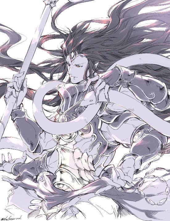 1boy black_hair colored_skin extra_arms gauntlets granblue_fantasy holding holding_polearm holding_weapon long_hair male_focus merry_(secilhodoshima) monster_boy polearm purple_skin shiva_(granblue_fantasy) snake solo weapon white_snake