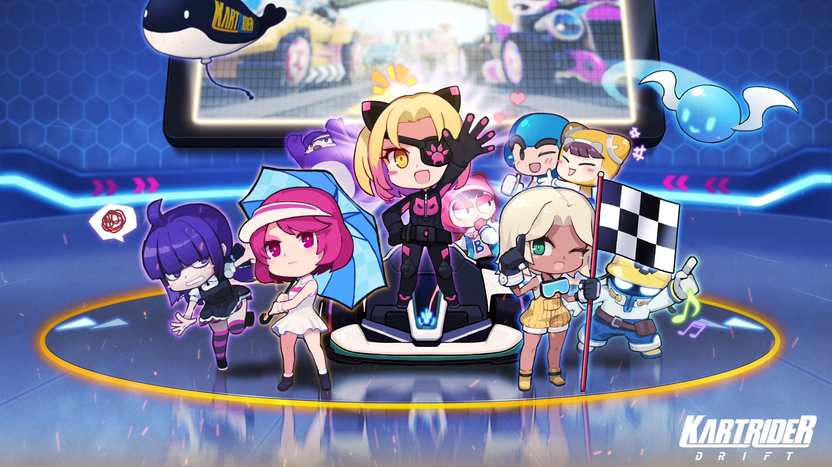 4boys 5girls :d ahoge airi_(kartrider) angry animal_ears bazzi_(kartrider) belt black_bodysuit blonde_hair blunt_bangs blush bodysuit boots brodi_(kartrider) cat_ears closed_eyes college_shirt dao_(kartrider) dark-skinned_female dark_skin diz_(kartrider) dress eyepatch fake_animal_ears flag gloves go-kart goggles goggles_around_neck green_eyes happy helmet highres holding holding_umbrella jacket kartrider kartrider:_drift keffy_(kartrider) knee_pads kneehighs kris_(kartrider) logo marid_(kartrider) multicolored_hair multiple_boys multiple_girls official_alternate_costume official_art one_eye_closed open_clothes open_hand open_jacket open_mouth pink_eyes pink_hair purple_eyes purple_hair short_hair smile socks sophia_(kartrider) standing two-tone_gloves two-tone_hair umbrella visor_cap white_dress white_gloves yellow_eyes