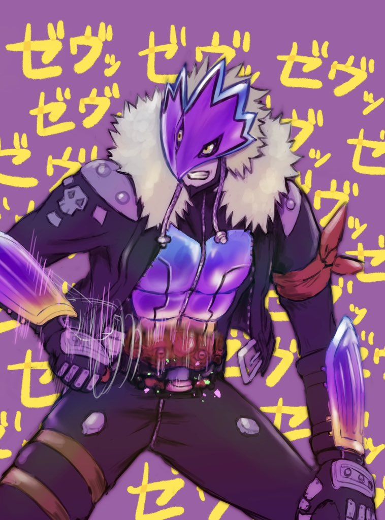 1boy beelzebumon black_background black_jacket blonde_hair cowboy_shot digimon digimon_(creature) fur-trimmed_jacket fur_trim green_eyes henshin_belt_gavv jacket kamen_rider kamen_rider_gavv_(series) male_focus mas_square open_clothes open_jacket purple_background purple_mask short_hair simple_background solo sound_effects third_eye