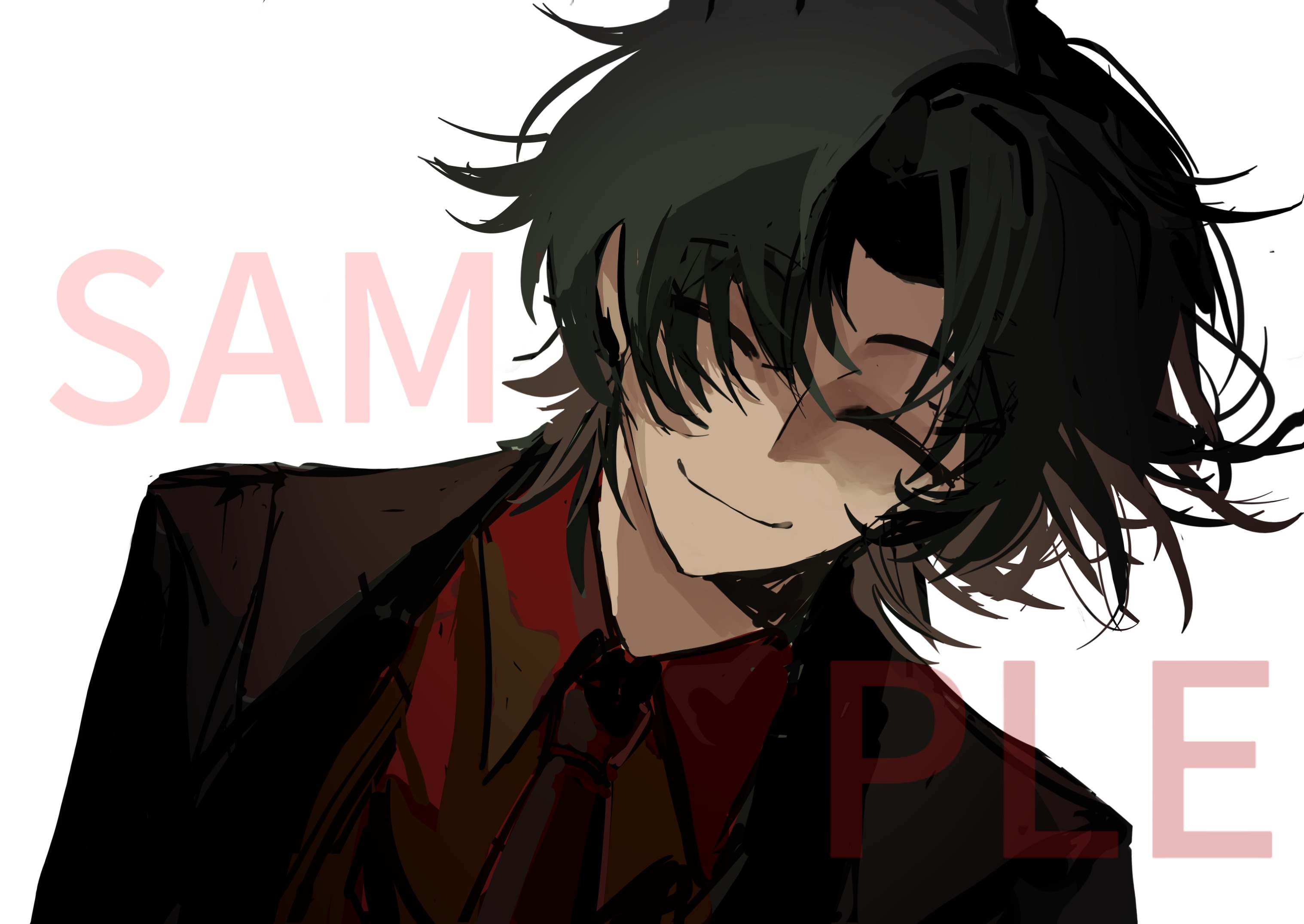 1boy black_hair black_jacket black_necktie chinese_commentary closed_eyes closed_mouth collared_shirt commentary_request curtained_hair dutch_angle facing_viewer guofenzhou highres jacket male_focus necktie parted_bangs portrait red_shirt sample_watermark shirt short_hair smile solo touqi_guaitan watermark white_background zhu_yaoxing