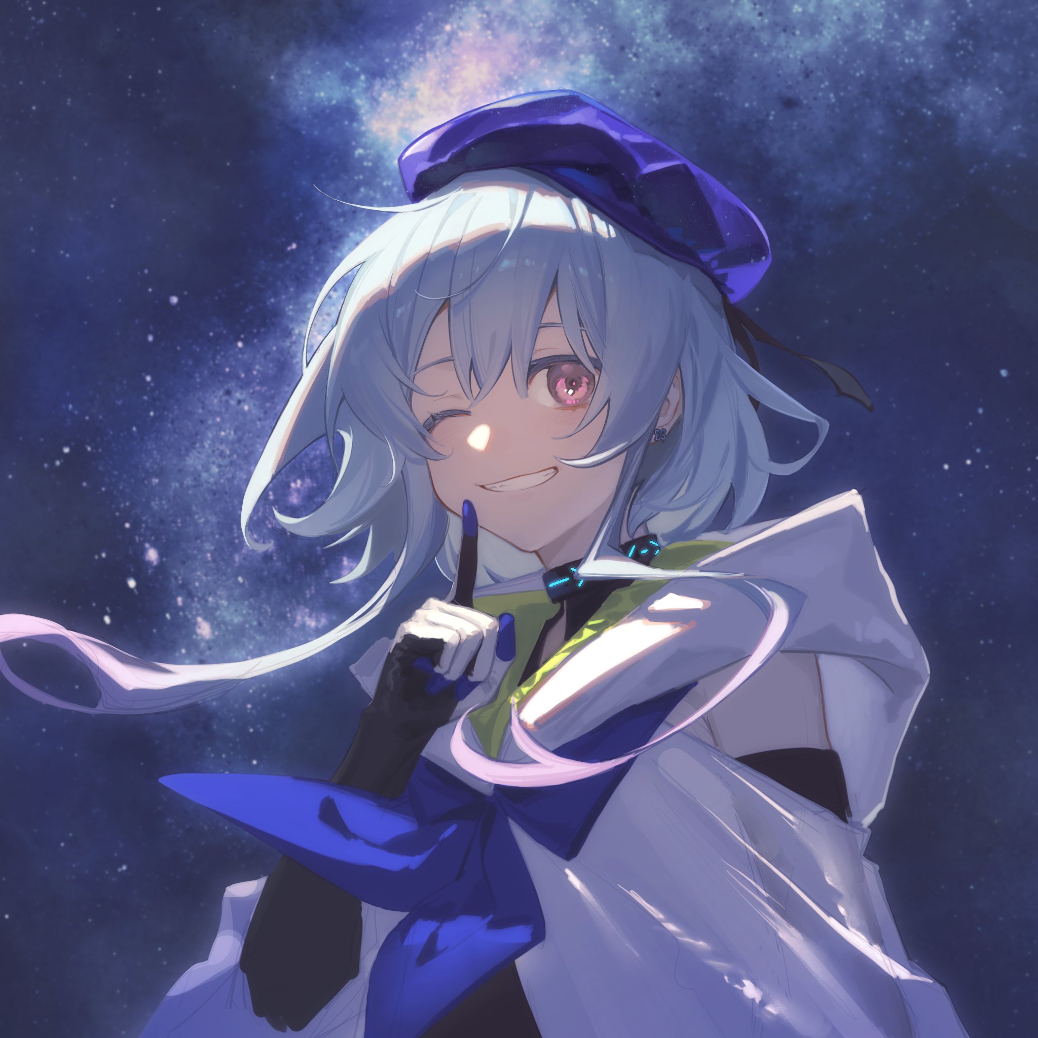 1boy arknights beret black_gloves blue_hair blue_hat blue_sky blush clothing_cutout commentary_request elbow_gloves gloves grin hat highres infection_monitor_(arknights) jacket looking_at_viewer male_focus mizuki_(arknights) night one_eye_closed outdoors pink_eyes poncho short_hair_with_long_locks shoulder_cutout sky smile solo star_(sky) starry_sky two-sided_gloves white_gloves white_jacket youling_niao_(siye_233)