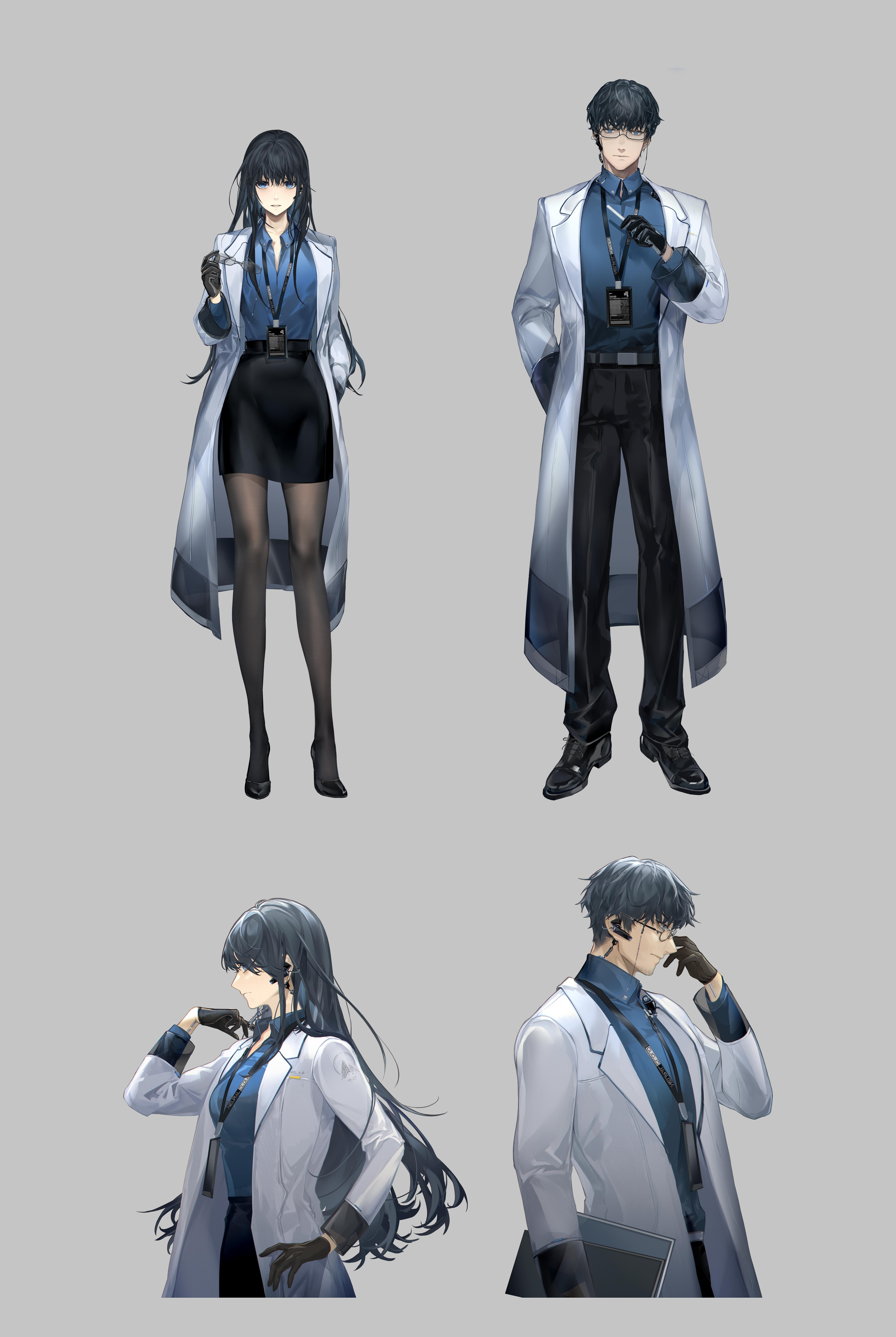 1boy 1girl absurdres adjusting_eyewear arm_behind_back belt black_belt black_footwear black_gloves black_hair black_pants black_pantyhose black_skirt blue_eyes blue_shirt closed_mouth coat collared_shirt dress_shirt earpiece eyewear_strap female_professor_(neural_cloud) folder from_side full_body girls'_frontline girls'_frontline_neural_cloud glasses gloves hand_on_own_hip hand_up high_heels highres holding holding_folder holding_pen holding_removed_eyewear id_card lab_coat lanyard long_hair looking_at_viewer male_professor_(neural_cloud) miniskirt official_art open_clothes open_coat oxfords pants pantyhose parted_lips pen pencil_skirt porafree professor_(neural_cloud) profile shirt shirt_tucked_in short_hair skirt standing straight-on tachi-e unworn_eyewear upper_body white_coat