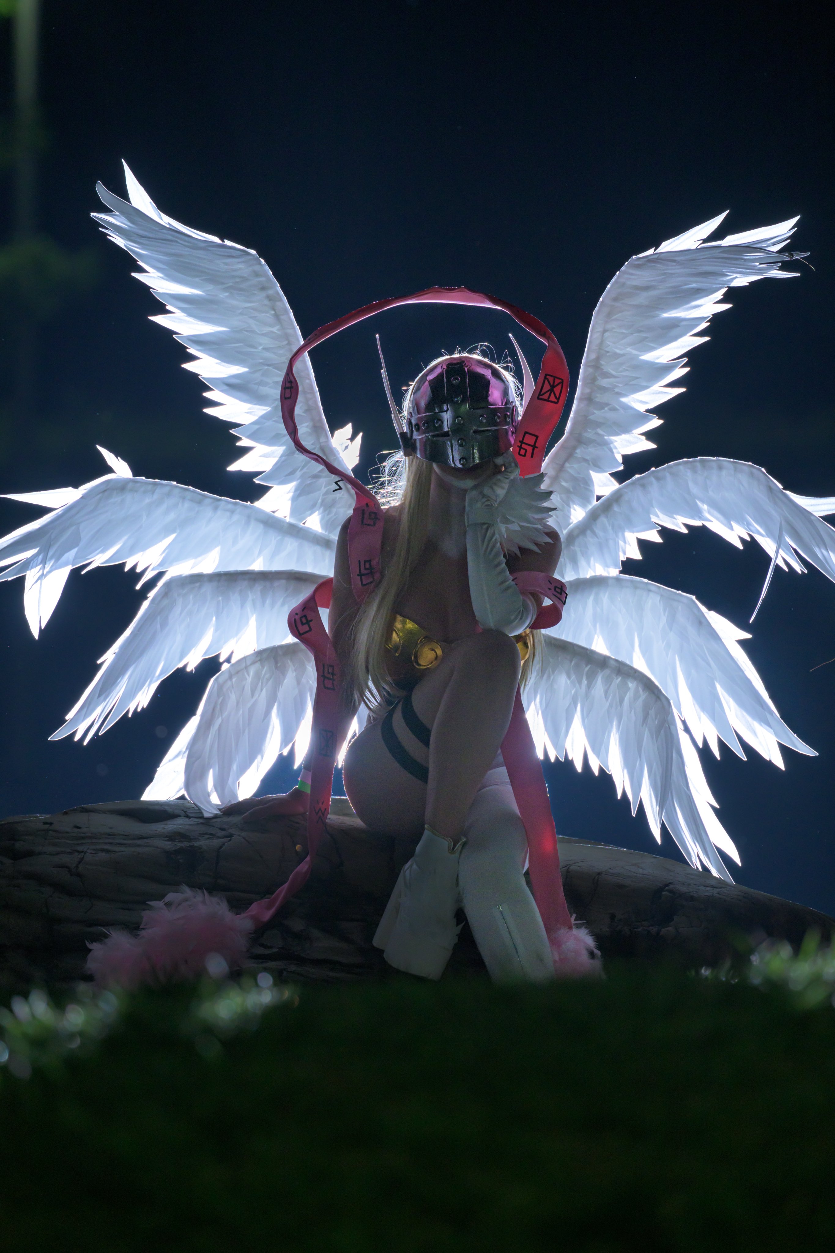 1girl absurdres angel angel_girl angewomon angewomon_(cosplay) armor breastplate breasts cosplay crossed_legs digimon digimon_(creature) head_wings helmet highres leotard long_hair looking_up luna_kamijo mask night outdoors photo_(medium) real_life sitting sky smile standing white_leotard wings