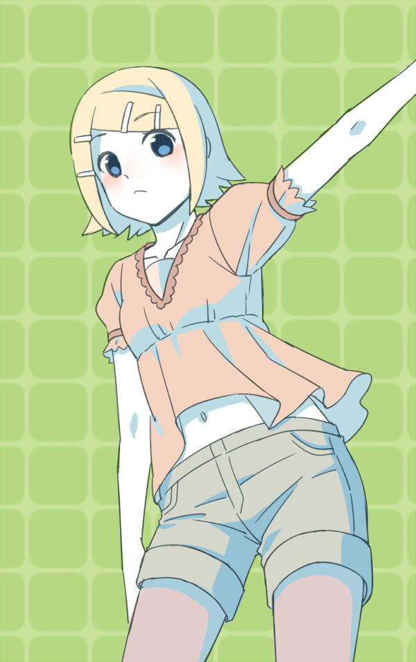 1girl :< bare_arms blonde_hair blouse blue_eyes blush breasts frilled_shirt frills from_below green_background grimay kagamine_rin leggings limited_palette looking_at_viewer looking_down midriff_peek navel pink_shirt puffy_short_sleeves puffy_sleeves shirt short_sleeves shorts small_breasts solo vocaloid