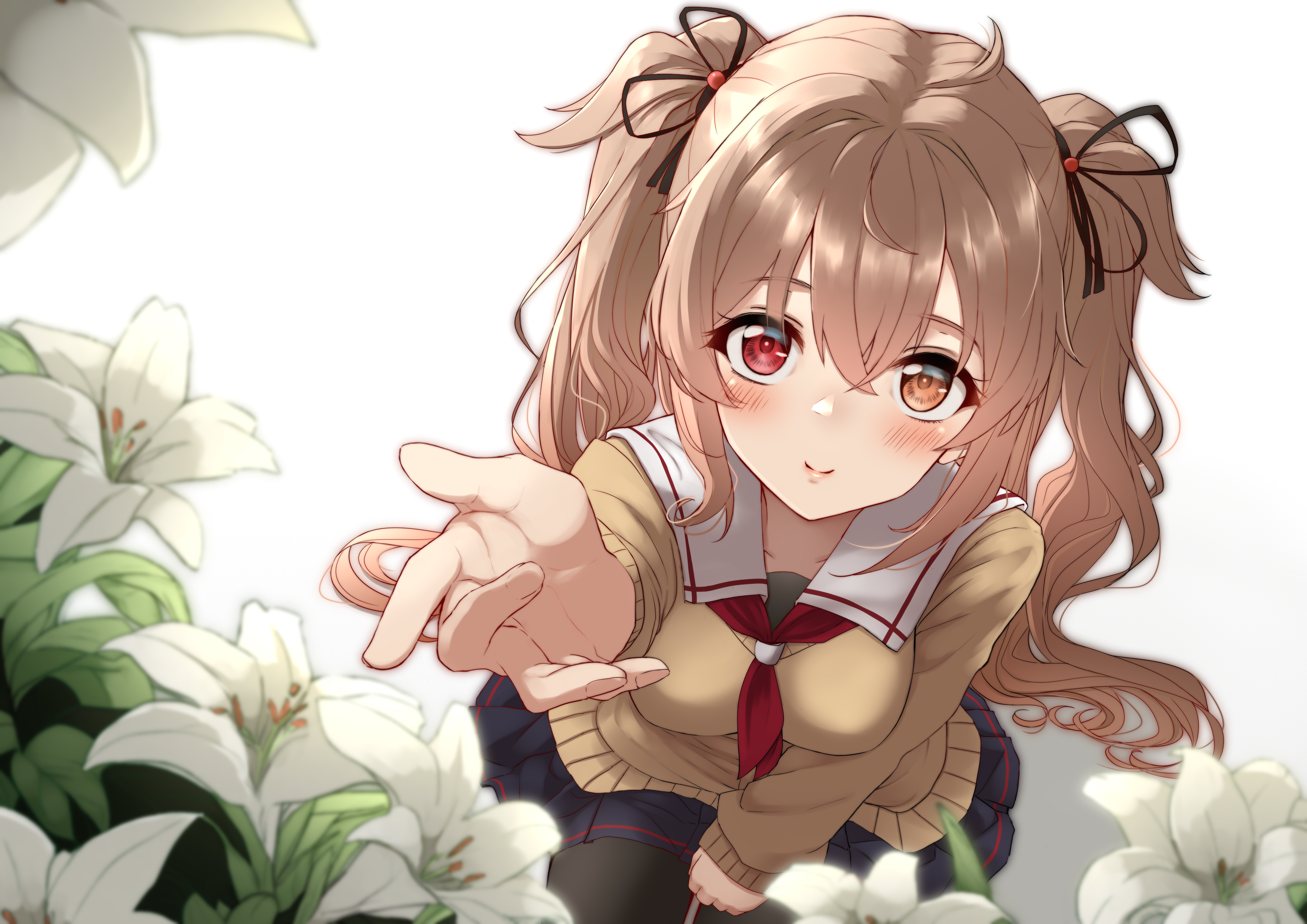 1girl absurdres black_pantyhose black_serafuku blush breasts brown_eyes brown_hair cardigan flower hair_flaps hair_ornament hair_ribbon hairclip heterochromia highres kantai_collection light_brown_hair long_hair looking_at_viewer medium_breasts murasame_(kancolle) murasame_(saury_festival)_(kancolle) murasame_kai_ni_(kancolle) neckerchief nuka_(nvkka) official_alternate_costume pantyhose pleated_skirt red_eyes red_neckerchief ribbon school_uniform serafuku sitting skirt smile solo twintails two_side_up