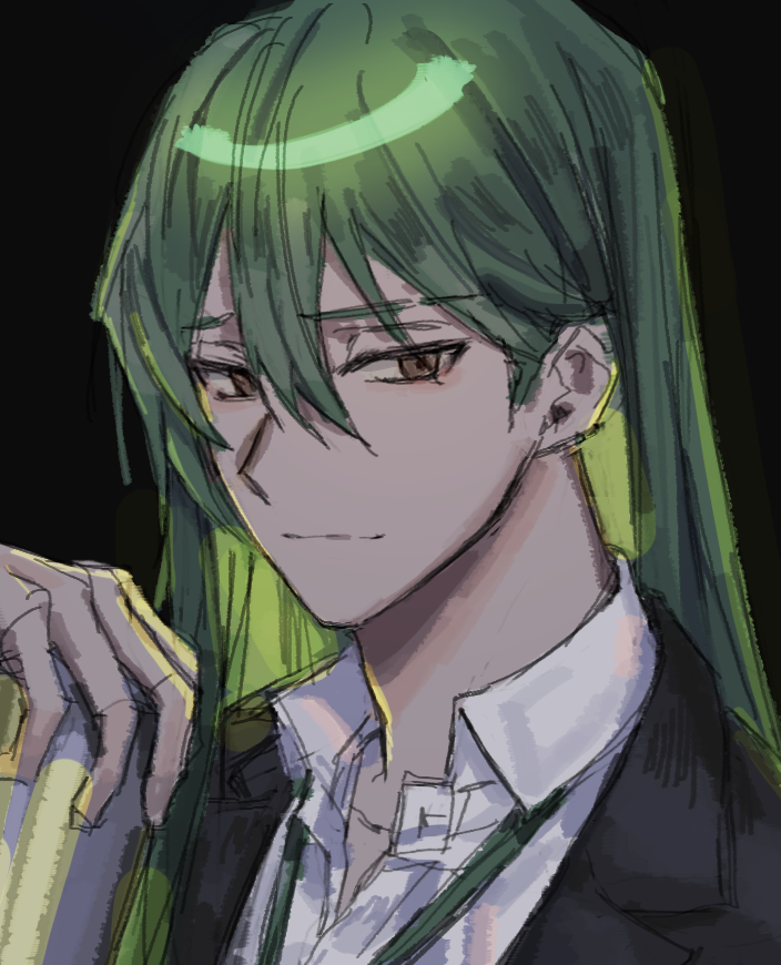 1boy black_background black_jacket brown_eyes can closed_mouth collared_shirt green_hair green_necktie holding holding_can isamu_(gaioo0303) jacket lapels lobotomy_corporation long_hair looking_at_viewer necktie netzach_(project_moon) notched_lapels portrait project_moon shirt simple_background smile solo very_long_hair white_shirt