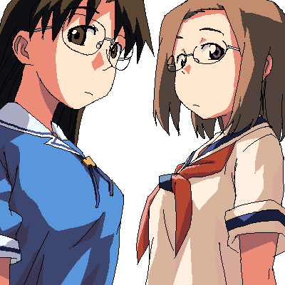 00s 2girls azumanga_daiou brown_eyes brown_hair crossover glasses kamichu! lowres mizuhara_koyomi multiple_girls oekaki school_uniform serafuku shijou_mitsue short_hair