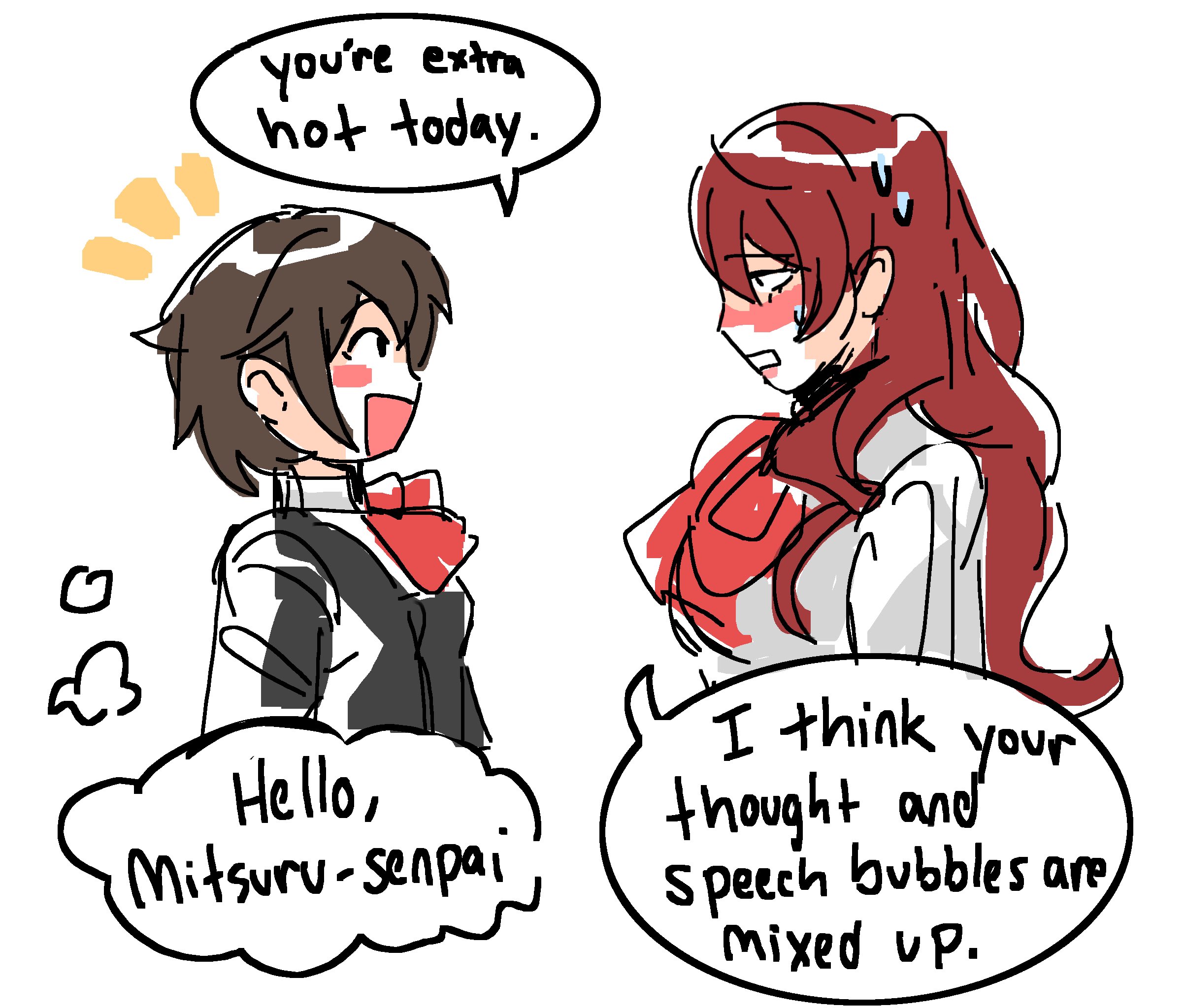2girls black_eyes blush bow breasts commentary english_commentary english_text gimmie20dollas hair_behind_ear highres kirijou_mitsuru medium_breasts multiple_girls nervous_sweating notice_lines persona persona_3 red_bow red_hair shirt sketch small_breasts speech_bubble surprised sweat thought_bubble white_shirt