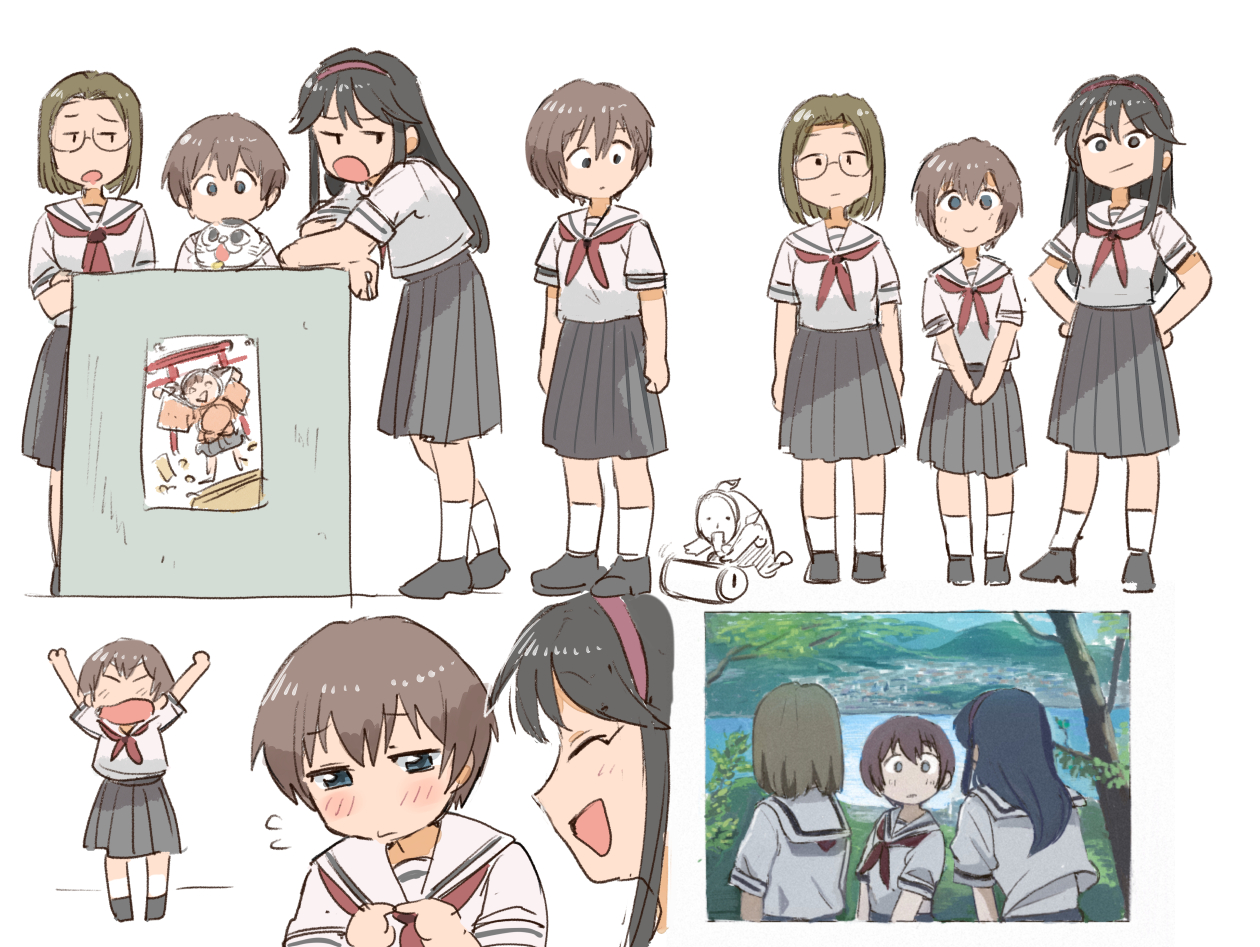 3girls blush bob_cut brown_hair multiple_expressions full_body glasses hairband hitotsubashi_yurie japanese_clothes kamichu! long_hair miko multiple_girls multiple_views open_mouth saegusa_matsuri sailor_collar school_uniform shijou_mitsue short_hair simple_background skirt tsubobot white_background