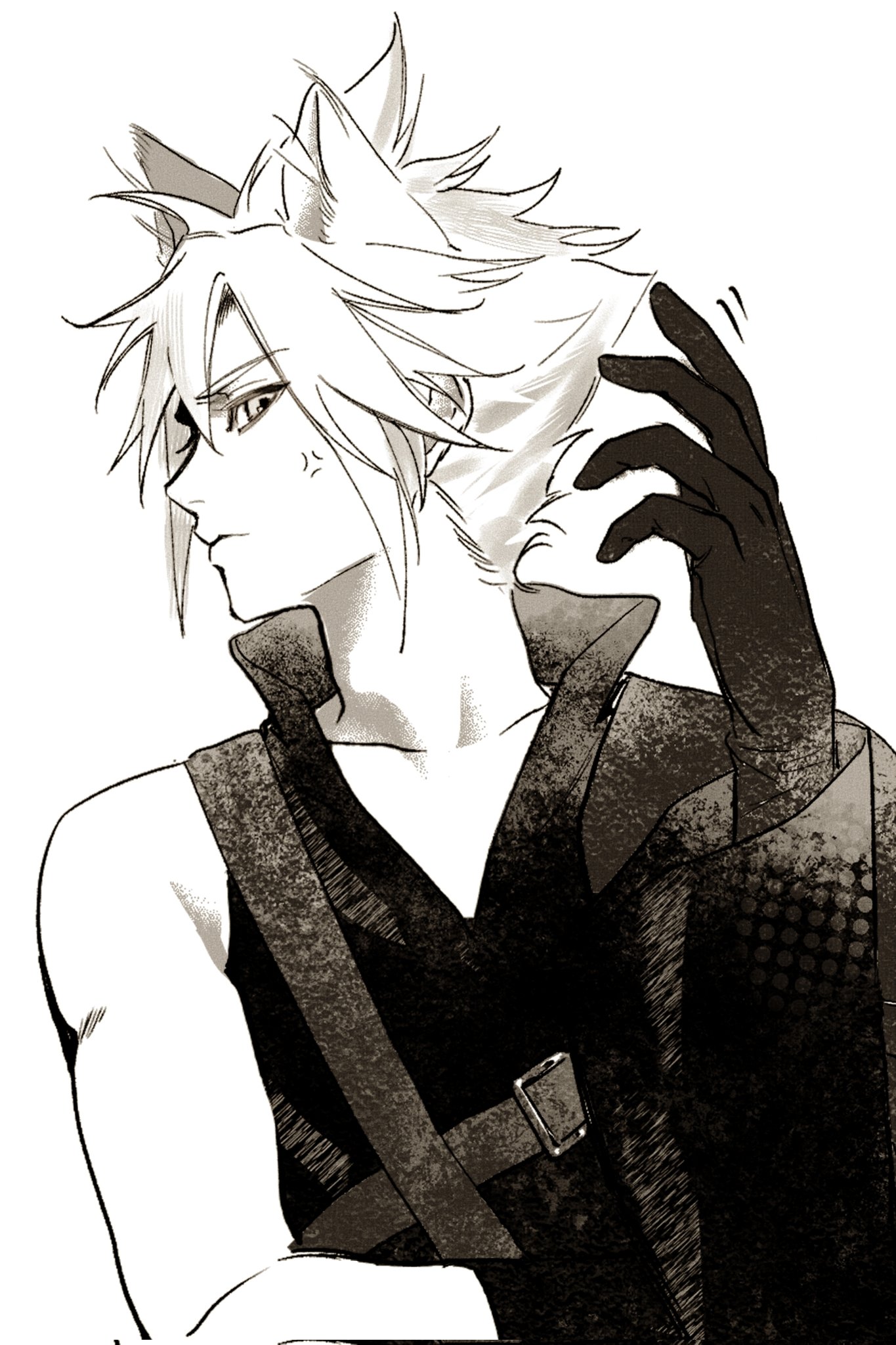 anger_vein animal_ears annoyed armor asymmetrical_sleeves black_gloves black_vest cat_ears cloud_strife commentary facing_to_the_side final_fantasy final_fantasy_vii final_fantasy_vii:_advent_children gloves greyscale high_collar highres kemonomimi_mode male_focus monochrome nijomushi pauldrons possessed possession short_hair shoulder_armor shoulder_strap simple_background single_pauldron solo spiked_hair square_enix toned toned_male upper_body vest white_background
