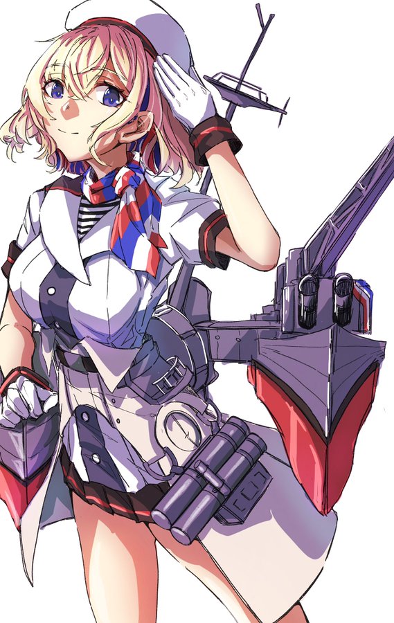 1girl blonde_hair blue_eyes blue_hair cannon colored_inner_hair gloire_(kancolle) gloves hat kantai_collection looking_at_viewer multicolored_hair neckerchief rigging salute ship_turret short_hair short_sleeves smile solo striped_neckerchief tonke white_gloves white_hat