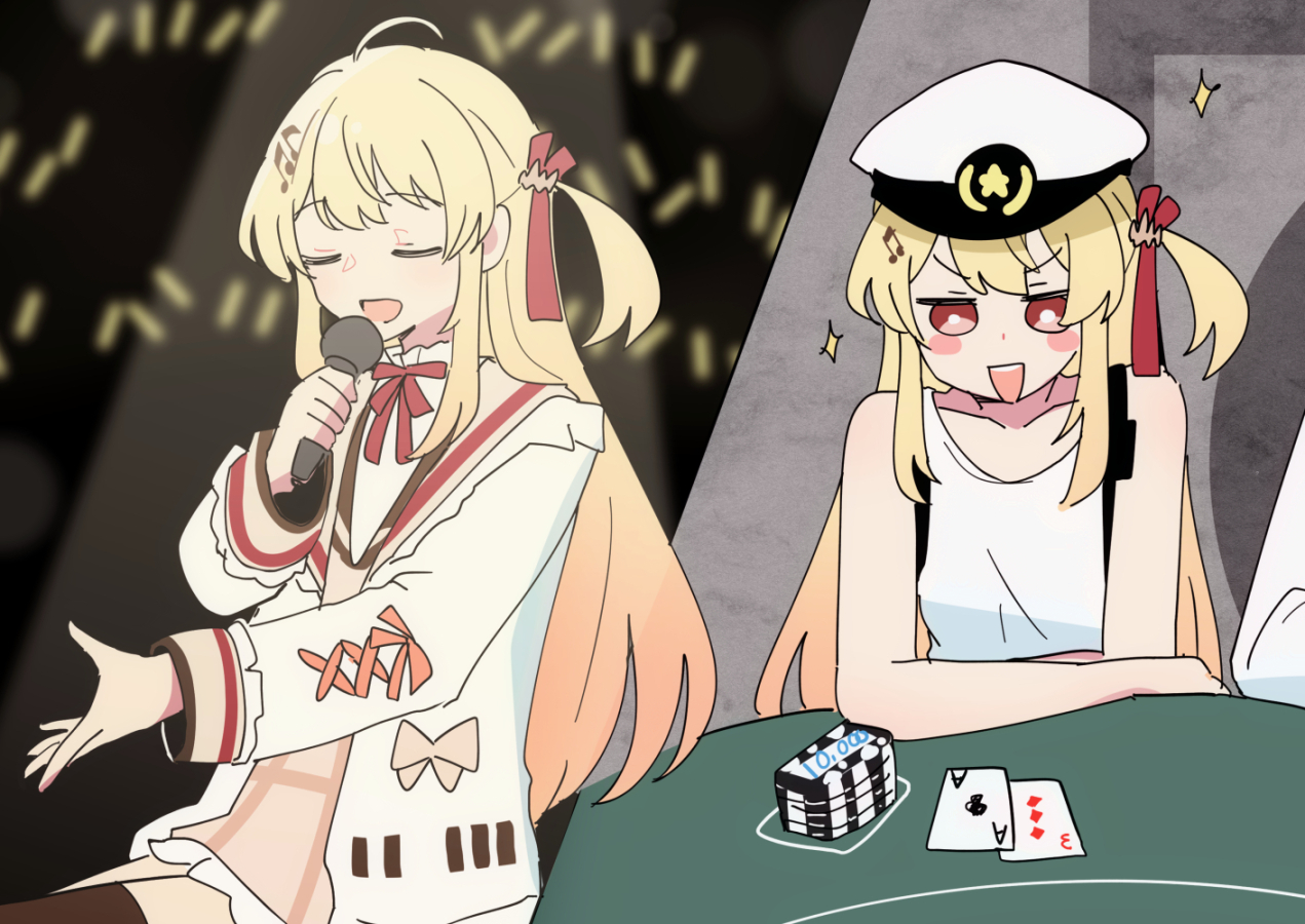 1girl ahoge blonde_hair card casino_card_table closed_eyes fortissimo gambling glowstick hair_ornament hat holding holding_microphone hololive hololive_dev_is hololive_grand_theft_auto jacket long_hair microphone music musical_note musical_note_hair_ornament one_side_up otonose_kanade otonose_kanade_(1st_costume) playing_card police_hat red_eyes sakana_(saka11205) singing spotlight table tank_top virtual_youtuber white_tank_top