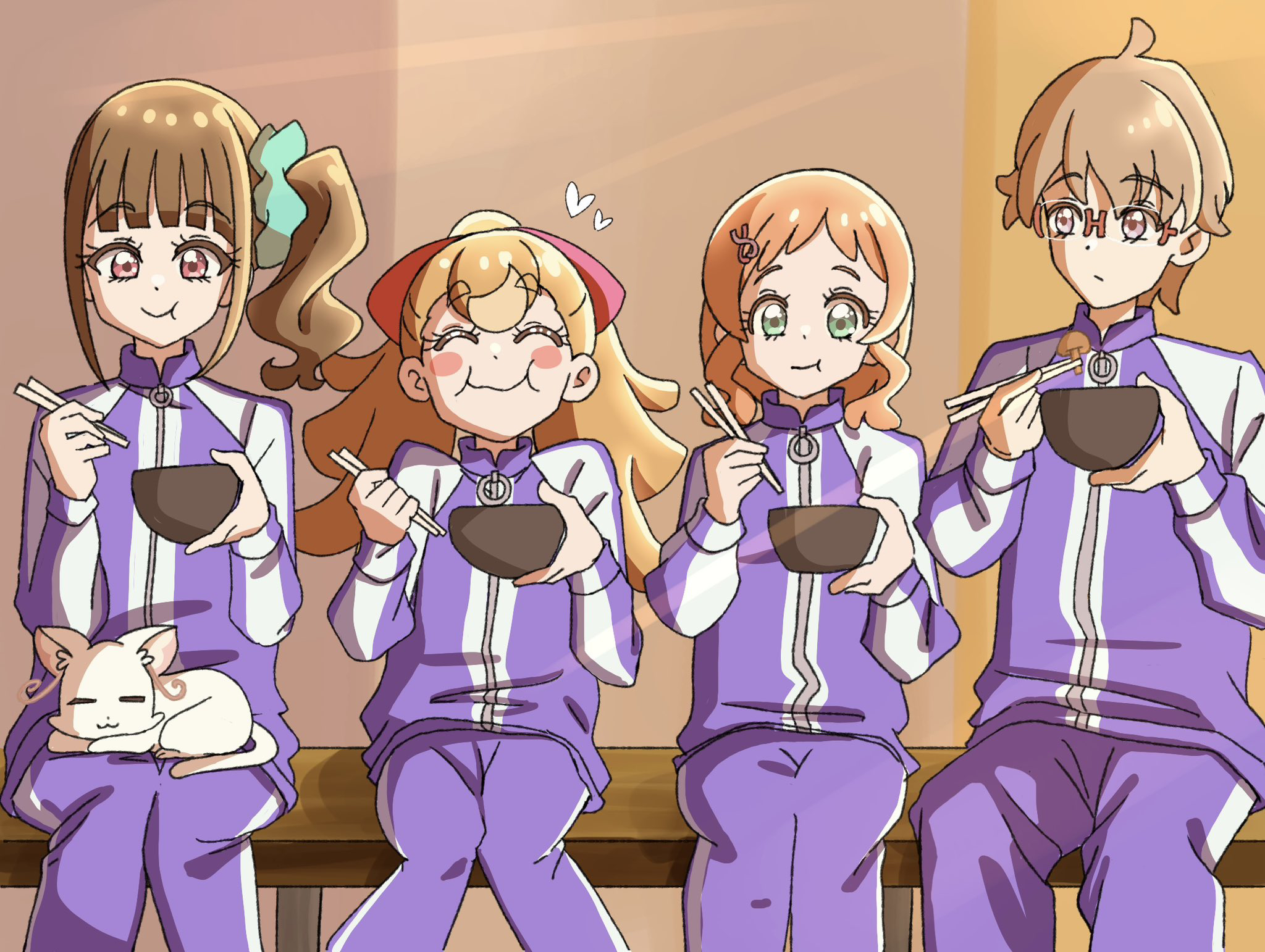 1boy 4girls akizora_(aki_precure) bench blush_stickers bow cat chopsticks eating glasses hair_bow hair_ornament hairclip highres inukai_iroha inukai_komugi multiple_girls nekoyashiki_mayu nekoyashiki_yuki nekoyashiki_yuki_(cat) ponytail precure side_ponytail sitting toyama_satoru track_suit wonderful_precure!