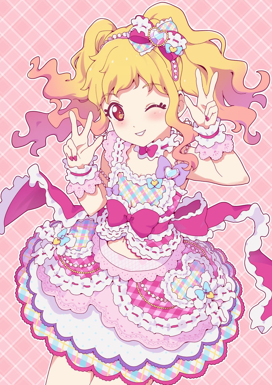 1girl :d aikatsu!_(series) aikatsu_stars! blonde_hair blush bow bow_hairband bowtie choker cowboy_shot cropped_shirt curly_hair dot_nose double_v frilled_bow frilled_choker frilled_cuffs frilled_sash frilled_shirt frilled_skirt frills gradient_hair grin hair_bow hairband hands_up highres idol legs_together long_hair looking_at_viewer midriff multicolored_hair navel nijino_yume one_eye_closed open_mouth orange_eyes orange_hair pink_background pink_bow pink_bowtie pink_hairband pink_sash pink_shirt pink_skirt plaid_background plaid_clothes plaid_shirt plaid_skirt sash shirt sidelocks skirt smile solo standing v white_choker white_wrist_cuffs wrist_cuffs yuniwo