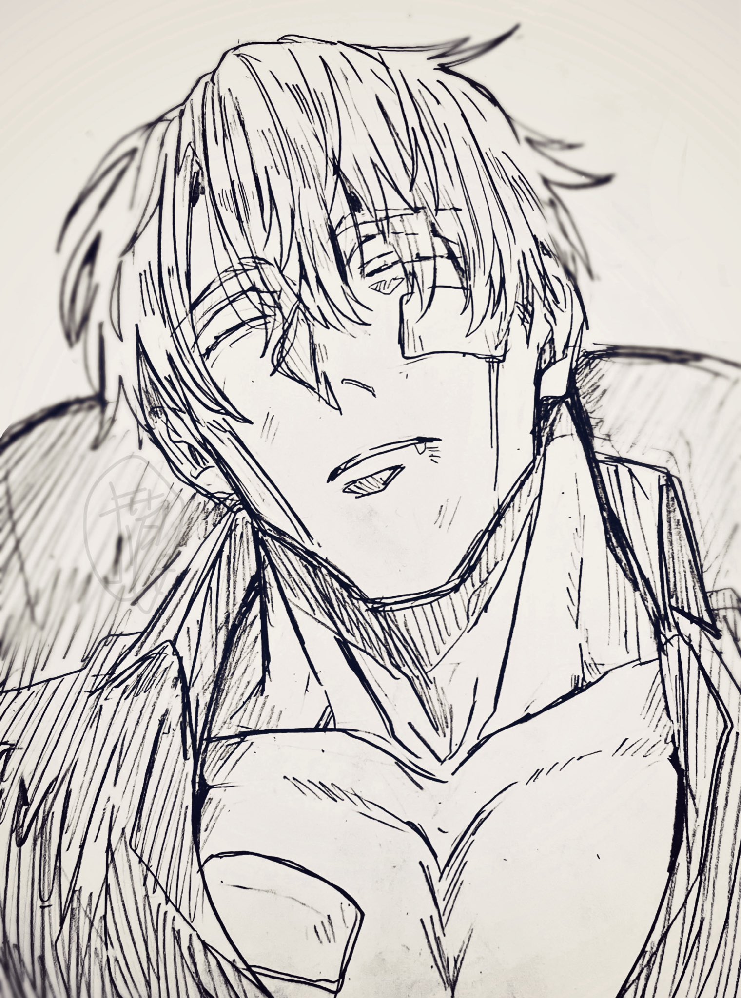 1boy bandage_on_cheek bandage_on_chest closed_eyes collarbone highres jujutsu_kaisen lips male_focus nanami_kento nekonii parted_lips pectorals portrait short_hair sketch solo