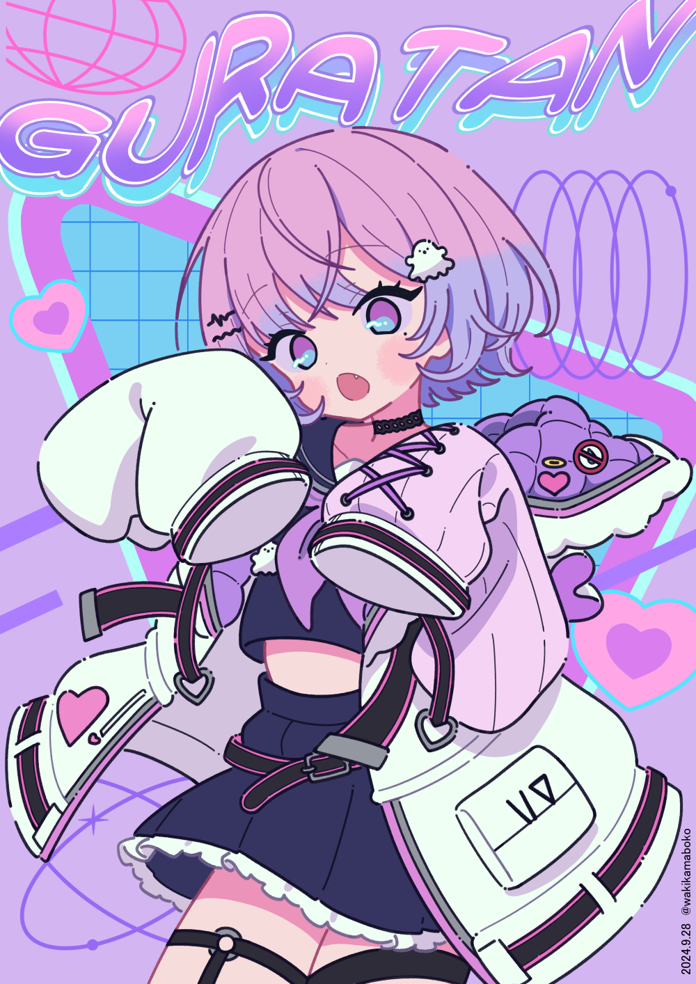 1girl black_sailor_collar black_serafuku black_shirt black_skirt commentary commission fang hair_ornament hairclip hands_up heart highres jacket long_sleeves looking_at_viewer neckerchief neki_(wakiko) open_clothes open_jacket open_mouth original pink_hair pleated_skirt puffy_long_sleeves puffy_sleeves purple_background purple_eyes purple_neckerchief sailor_collar school_uniform serafuku shirt skirt sleeves_past_fingers sleeves_past_wrists solo white_jacket