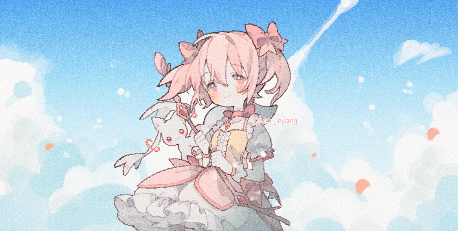 1girl blush bow bow_(weapon) bubble_skirt center_frills choker commentary_request day dress frilled_dress frills gloves hair_bow heo_nyang holding holding_bow_(weapon) holding_weapon kaname_madoka kaname_madoka_(magical_girl) korean_commentary kyubey looking_at_viewer magical_girl mahou_shoujo_madoka_magica mahou_shoujo_madoka_magica_(anime) petals pink_eyes pink_hair ribbon_choker short_sleeves skirt sky smile twintails weapon wind