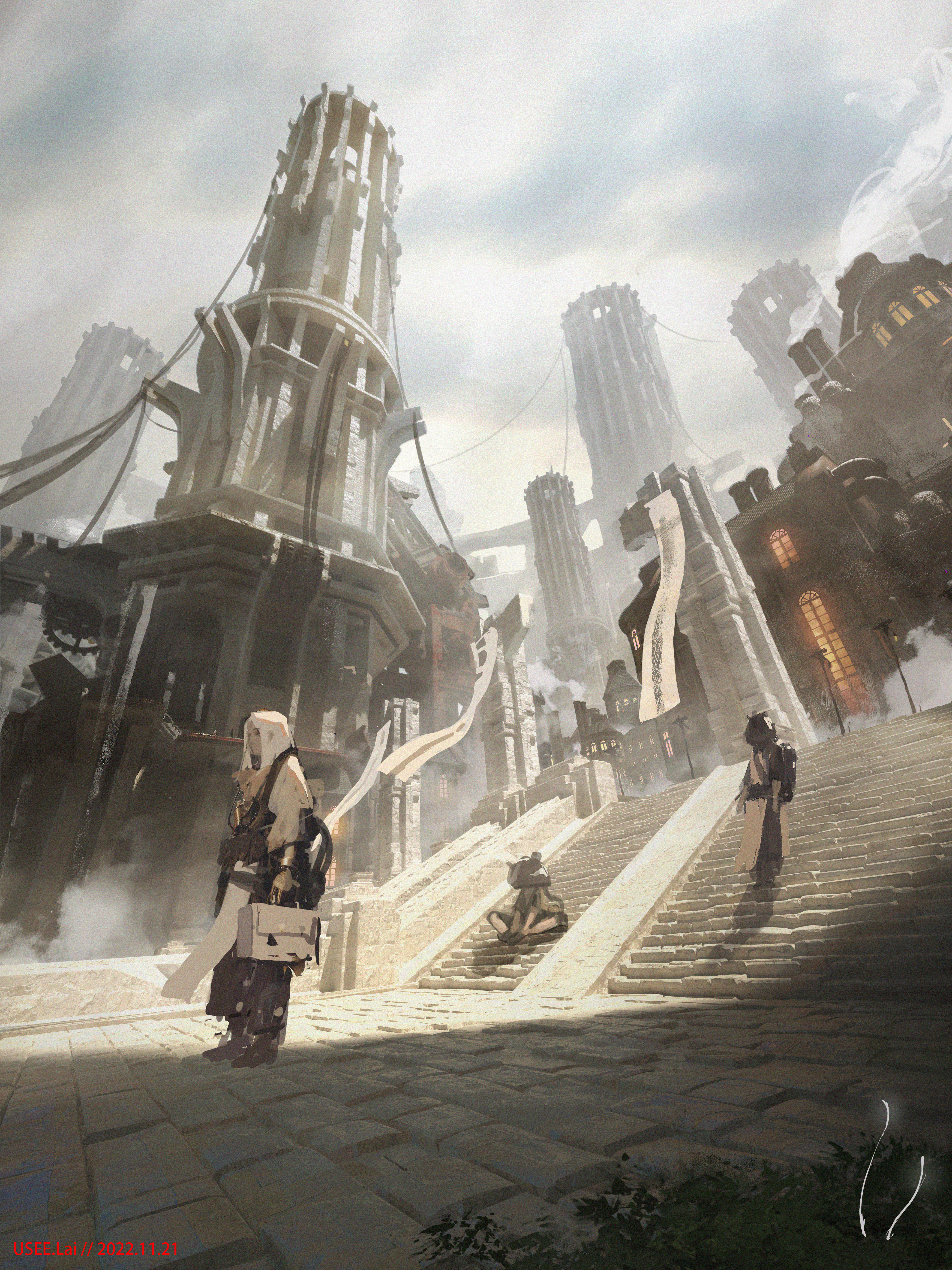 3boys absurdres banner brick_road building butterfly_sitting city cloud cloudy_sky commentary_request day grey_sky helmet highres holding holding_suitcase iridescent-usee lamppost long_hair mask multiple_boys original outdoors scenery sitting sky stairs standing suitcase tower white_hair