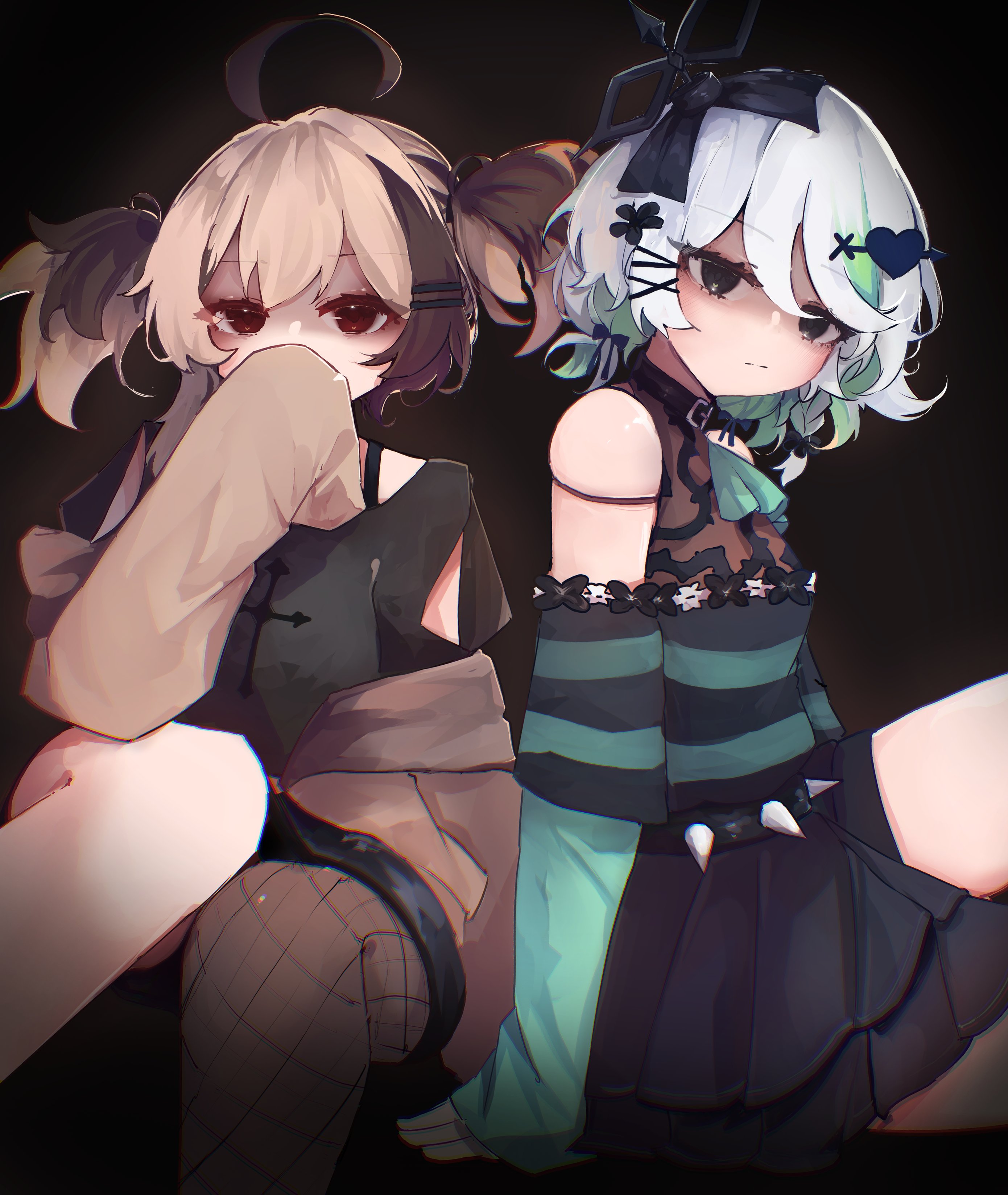 2girls :| absurdres alternate_costume arm_cutout arm_support ascot belt_collar black_background black_choker black_dress black_eyes black_shirt brown_hair cecilia_immergreen choker closed_mouth clothing_cutout collar colored_inner_hair commentary detached_sleeves doll_joints dress english_commentary expressionless eyelashes fishnet_thighhighs fishnets gigi_murin green_ascot green_hair green_sleeves hair_ornament hairclip hand_up heart heart_hair_ornament highres hololive hololive_english joints long_sleeves looking_at_viewer multicolored_hair multiple_girls off_shoulder shirt simple_background single_thighhigh sitting sleeves_past_wrists spiked_belt striped_clothes striped_shirt thighhighs thighs ty4nak virtual_youtuber white_hair winding_key x_hair_ornament