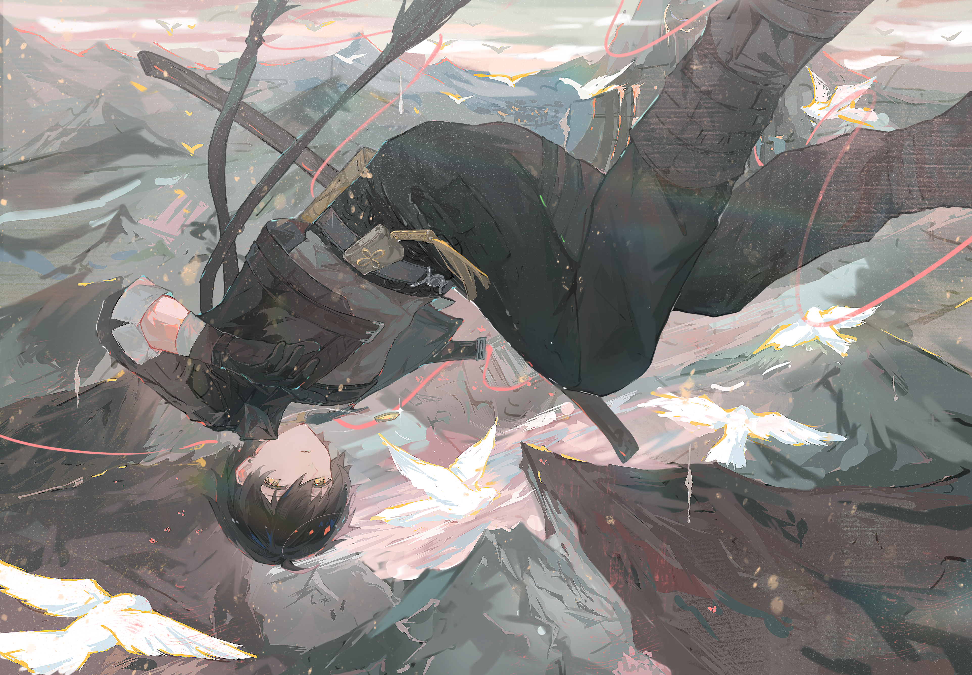 1boy absurdres black_footwear black_gloves black_hair black_jacket black_pants chinese_commentary closed_mouth commentary_request dog_tags earrings gloves grey_shirt hair_between_eyes highres jacket jewelry male_focus male_rover_(wuthering_waves) midair open_clothes open_jacket pants rover_(wuthering_waves) shirt sleeves_rolled_up solo stud_earrings upside-down wuthering_waves yellow_eyes yinsu391