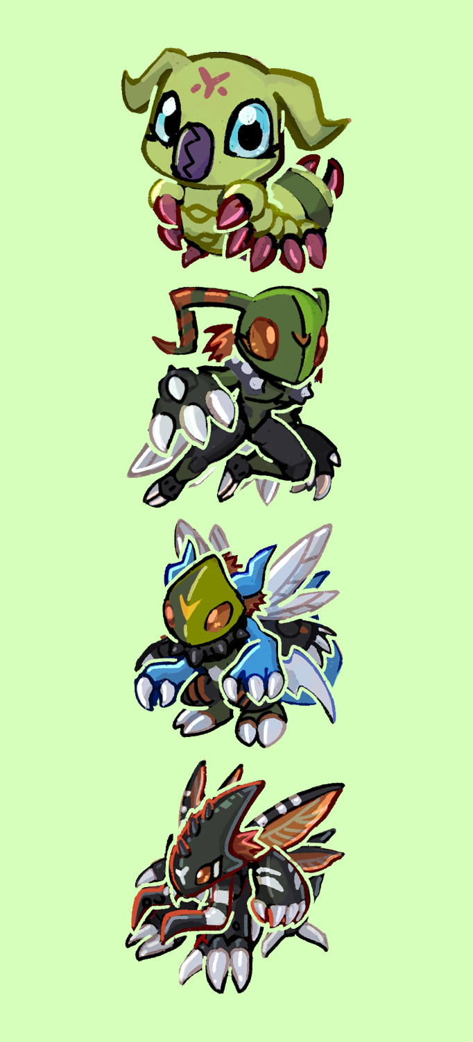 bug claws digimon digimon_(creature) digimon_adventure_02 dinobeemon evolutionary_line grankuwagamon highres simple_background stingmon wings wormmon