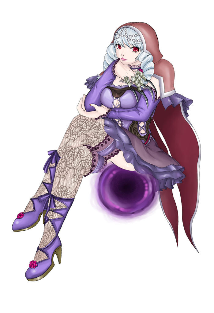 1girl bandai_namco breasts choker commentary crossed_legs english_commentary floating floating_object hand_on_own_chin high_heels hood looking_at_viewer magic nail_polish orb red_eyes red_nails sitting solo soul_calibur soulcalibur soulcalibur_v syahilla thighhighs thighs viola_(soulcalibur) white_hair